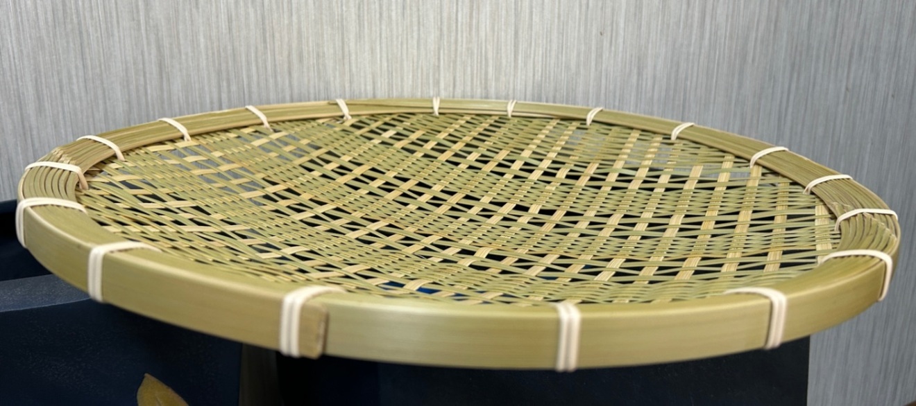 ☆真竹(福岡県)の生竹からヒゴを作り、一本一本丁寧に面取りをし、綺麗でしっかりとした「ござ目.網代複合編み」のザルです。