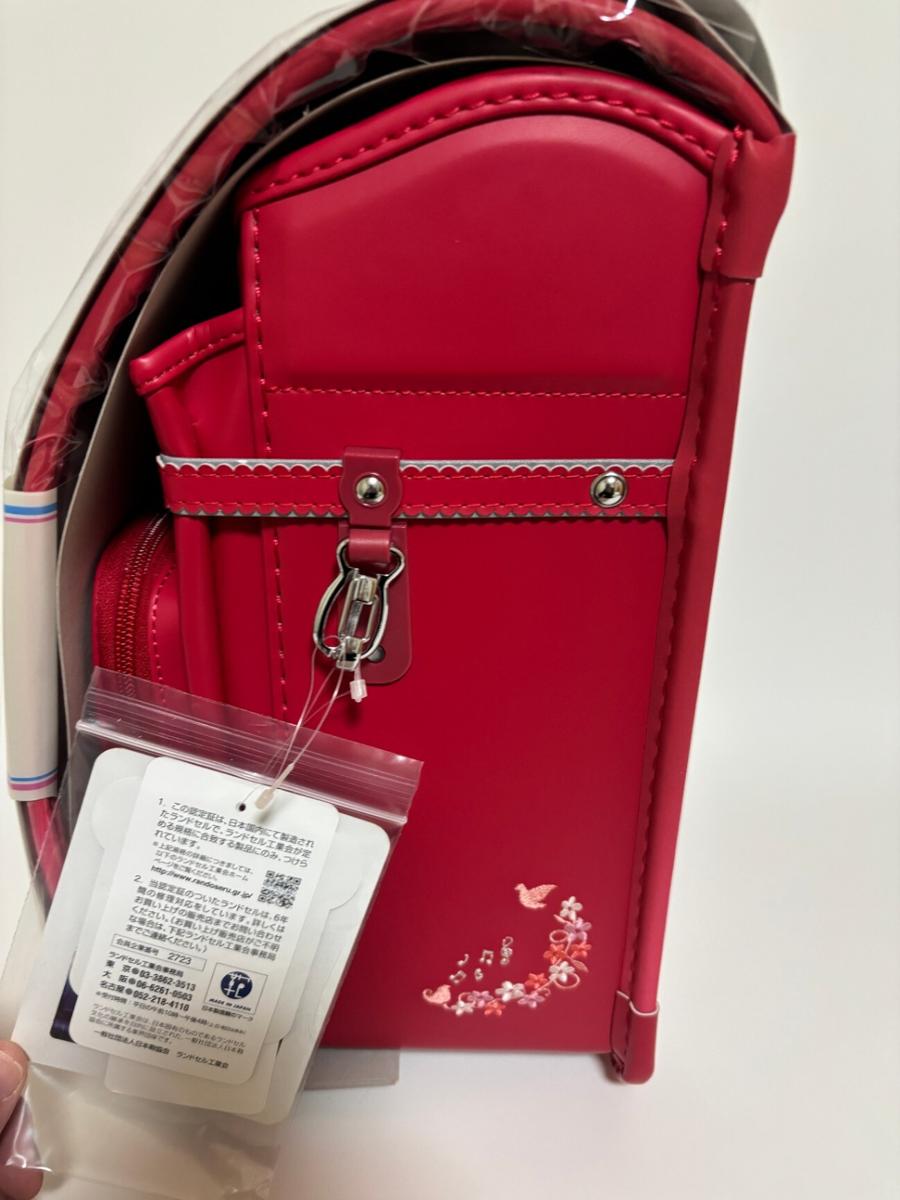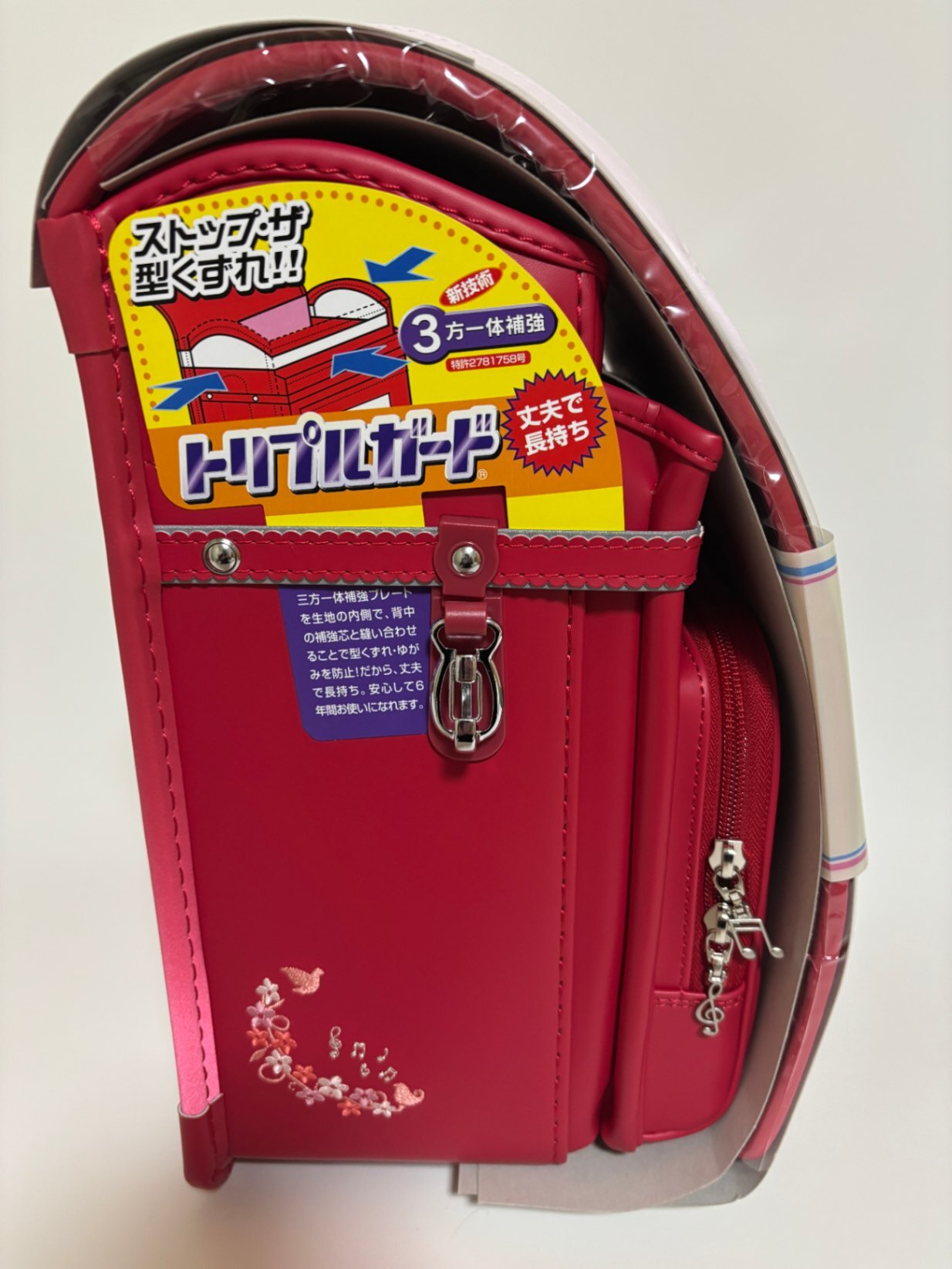 可愛らしい音符の鋲(びょう)や、さりげないお花の刺繍が施されており、細部までこだわりが詰まったデザインになっています。