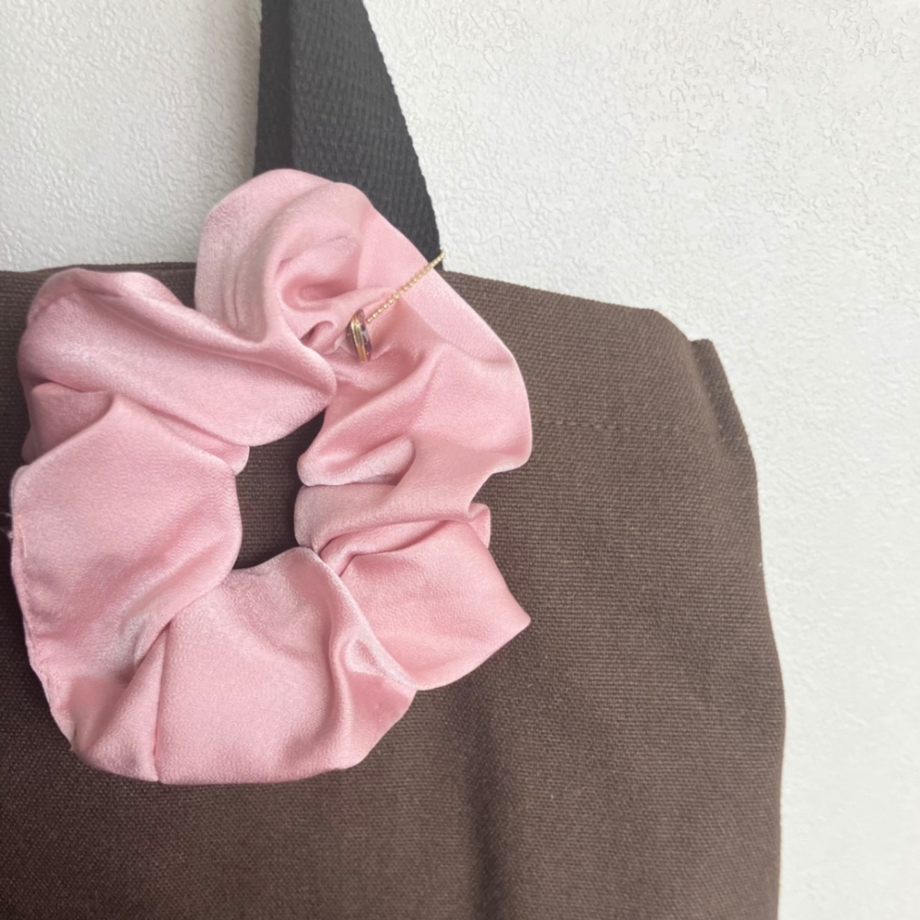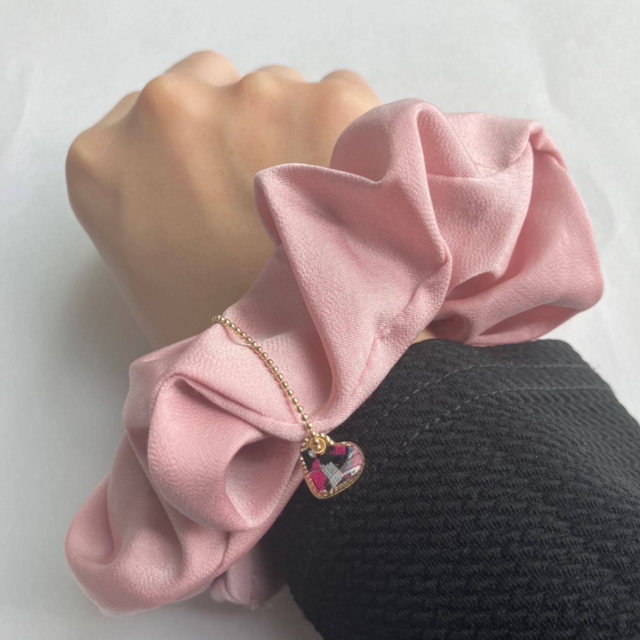 可愛いピンクのハートチャームのついたピンク色シュシュは