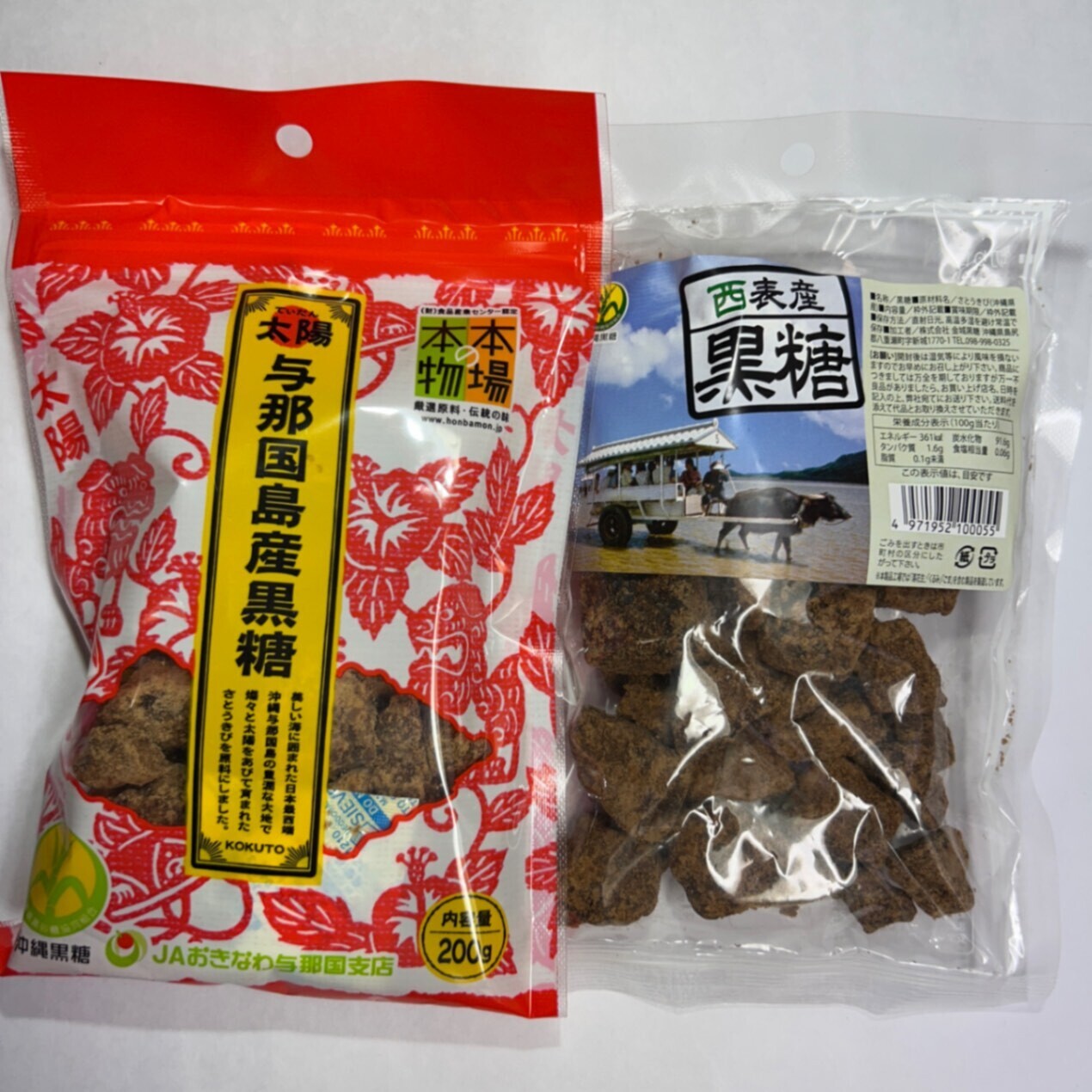 沖縄の離島、与那国島産200gと西表島産180gの黒糖を食べ比べできるセットです。