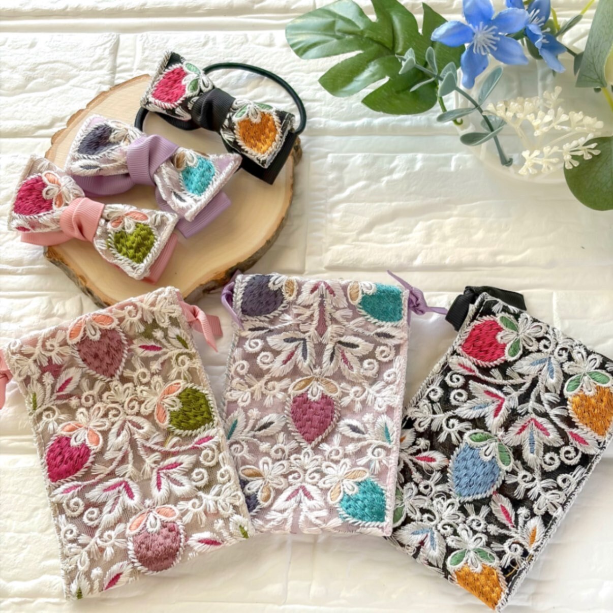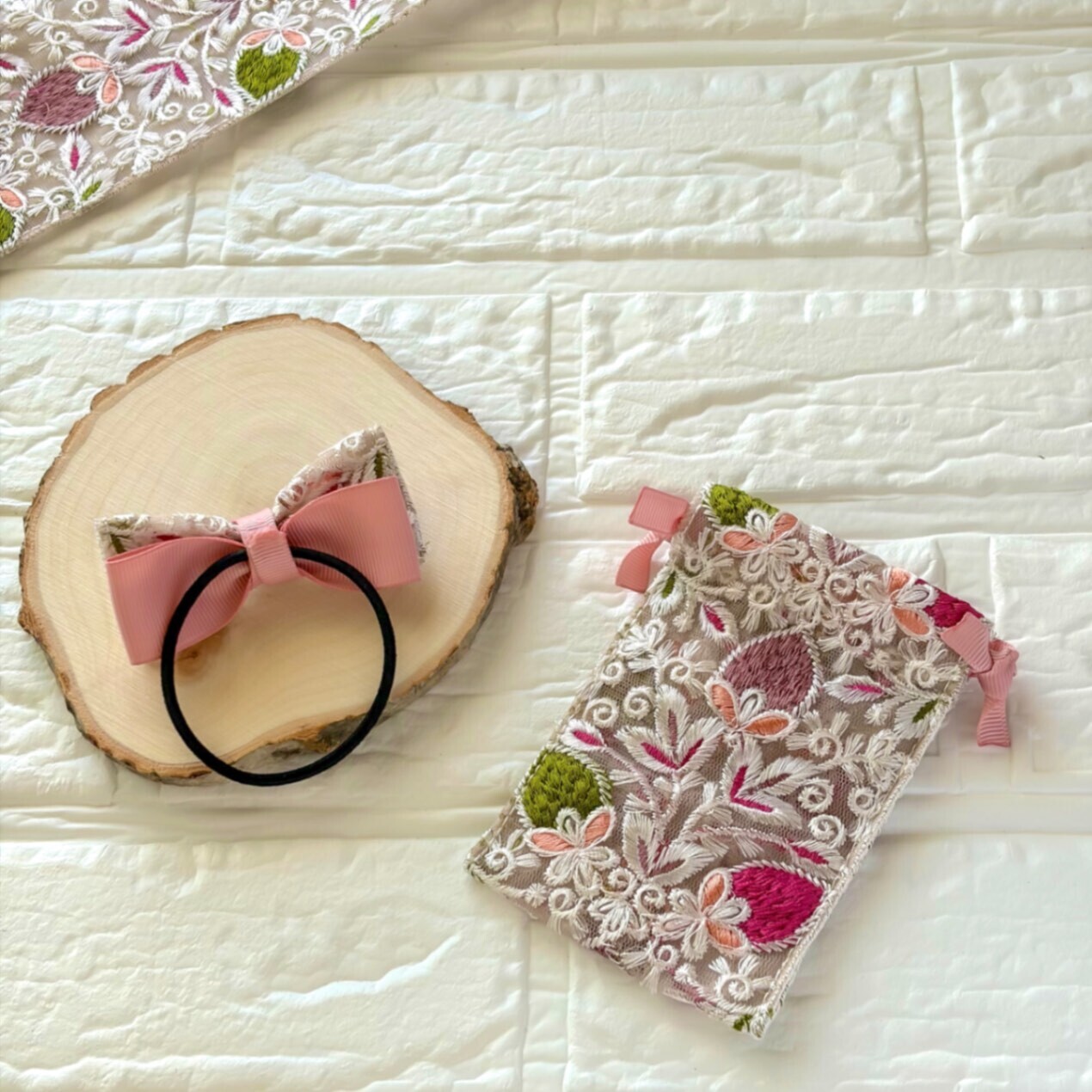 インド刺繍リボンのヘアゴムと巾着のセットです🩷