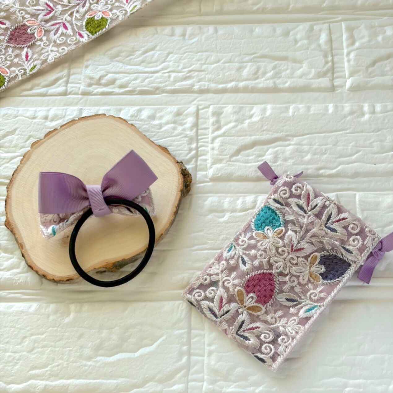 インド刺繍リボン🎀ヘアゴム&巾着 ライラック パープル