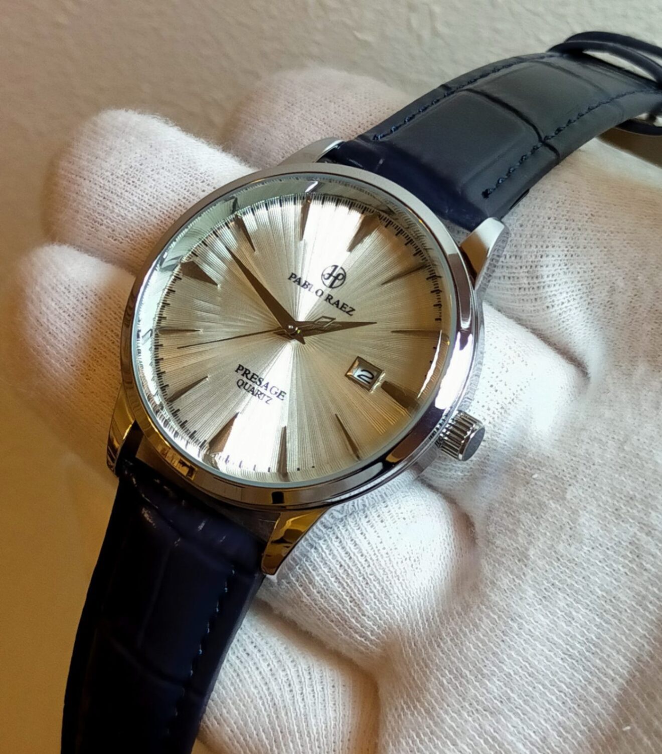 まず文字盤は中心から外側に向かって放射線状に伸びるラインは平板ではなく立体造形の為、光のあたり具合により様々な美しい表情を見せてくれます。