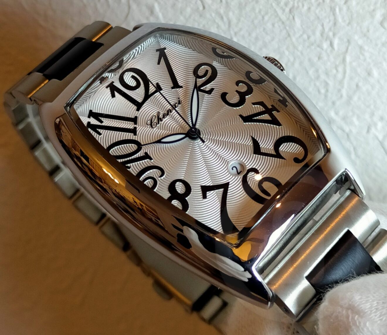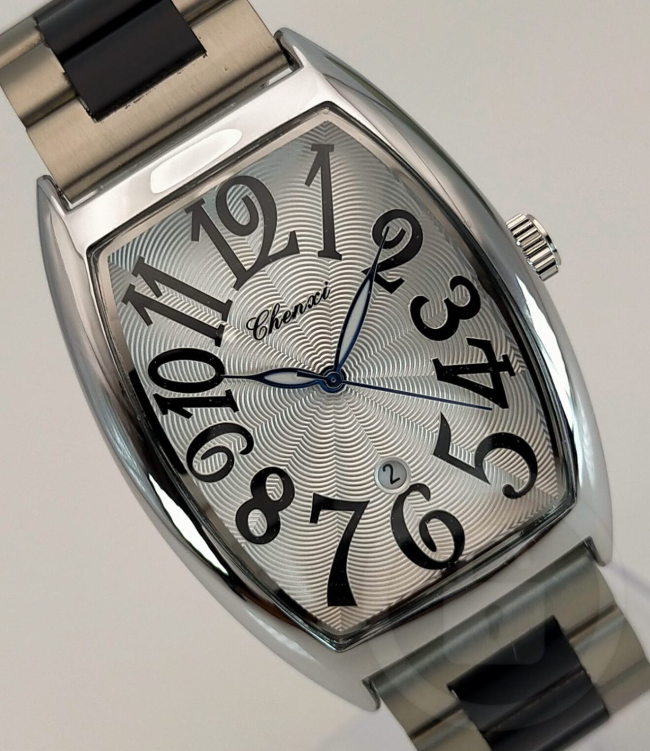 また廉価モデルにありがちな平板な文字盤でなく、表情豊かなギョーシェ風文字盤となっております。