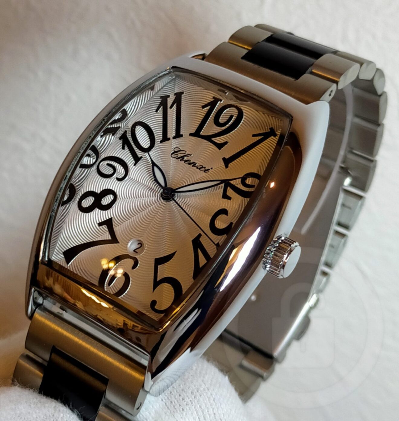 文字盤:ホワイトシルバー/ブラックインデックス(ギョーシェ風文字盤)