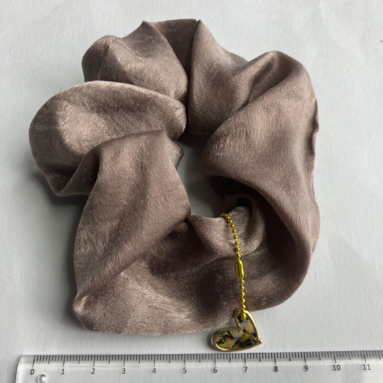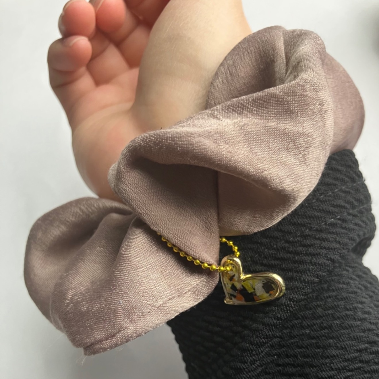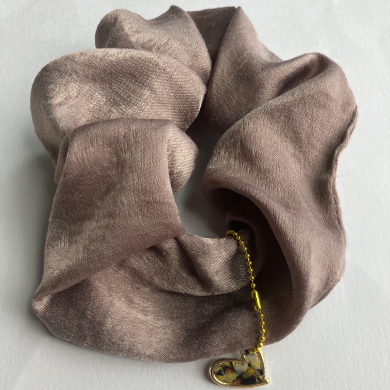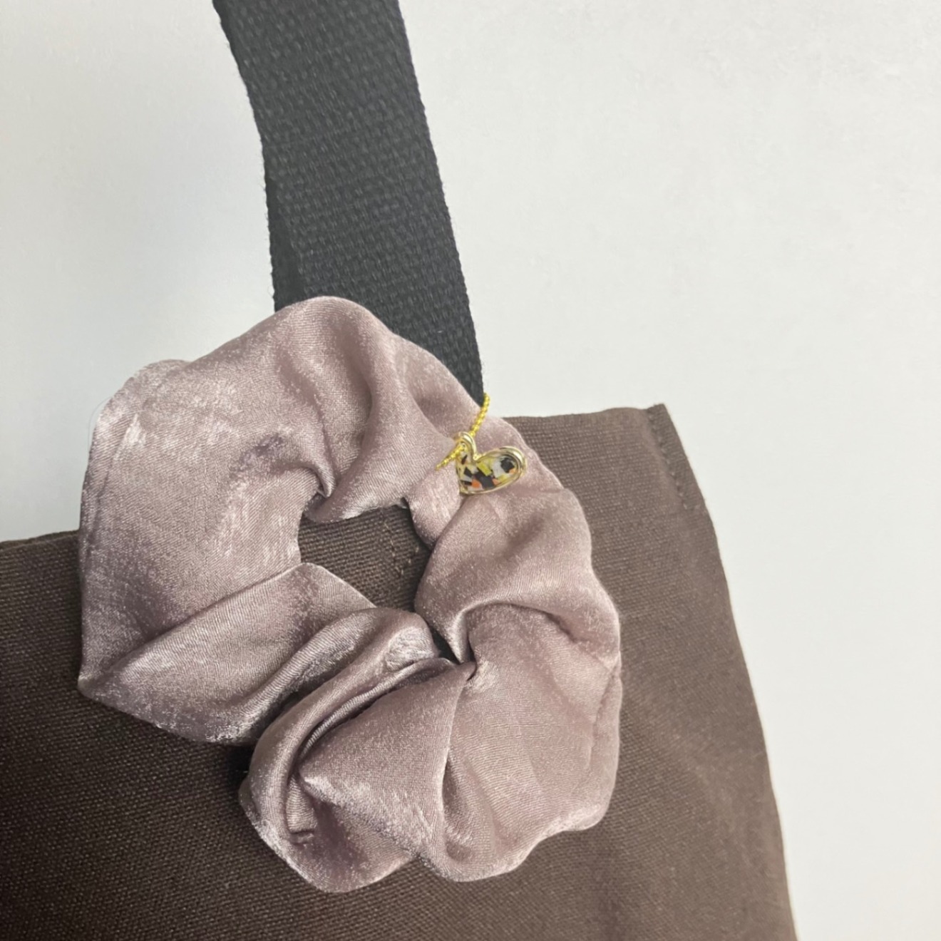 ・落ち着いたブラウン色のシュシュと可愛いハート💛の組み合わせは仕事でもプライベートでも身につけられる万能カラー