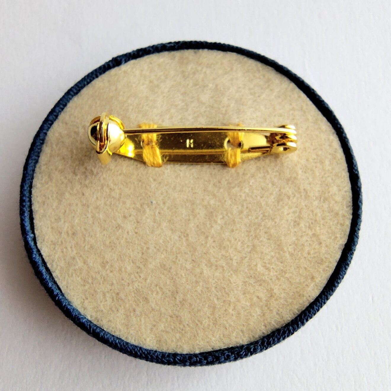 白ネコが前足を出してぐい〜っと伸びをしているところをブローチにしました。バラのピンク色と背景のネイビーの組み合わせが上品なブローチになりました。