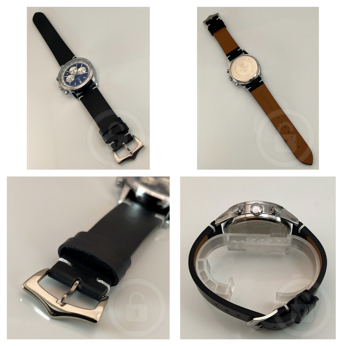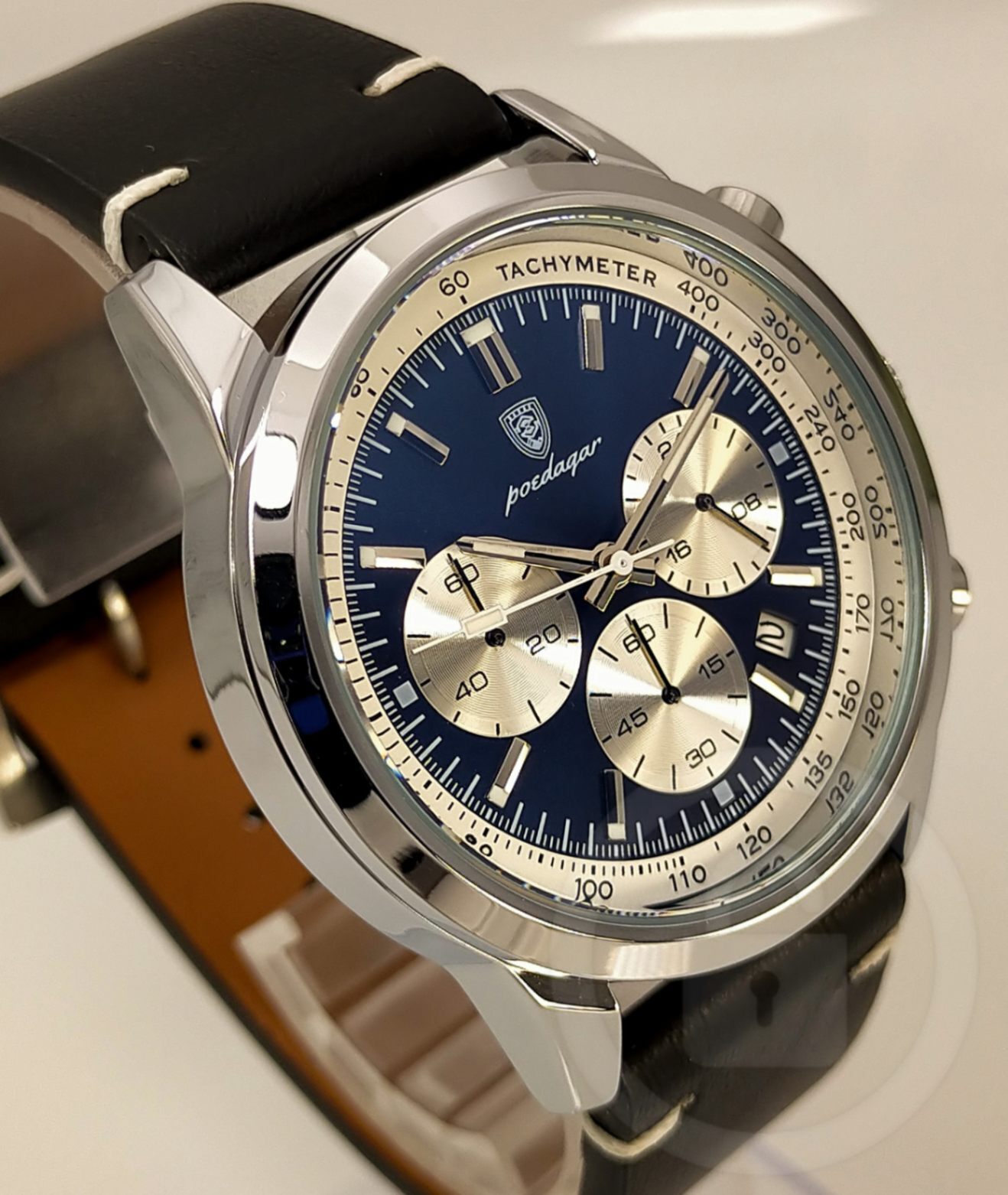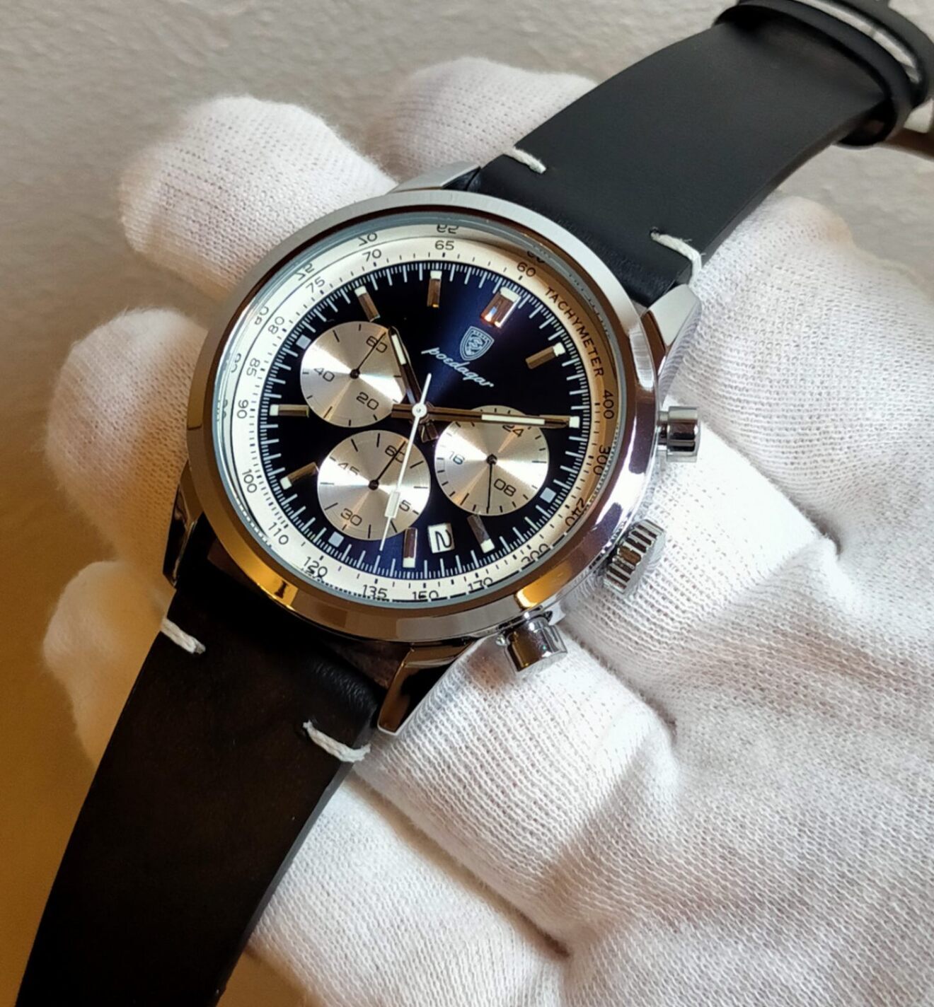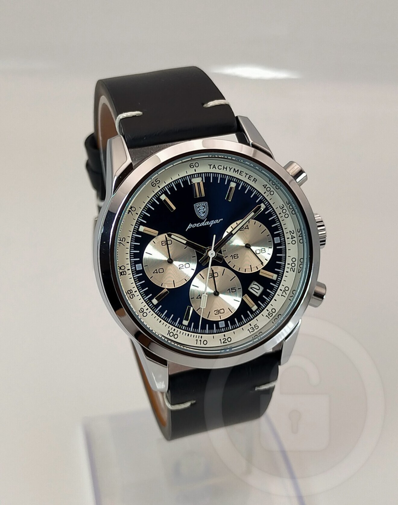ドレス系クロノグラフ/弓型尾錠【サファイアブルーを纏った美しすぎる緻密文字盤/新品】パンダ 黒レザー