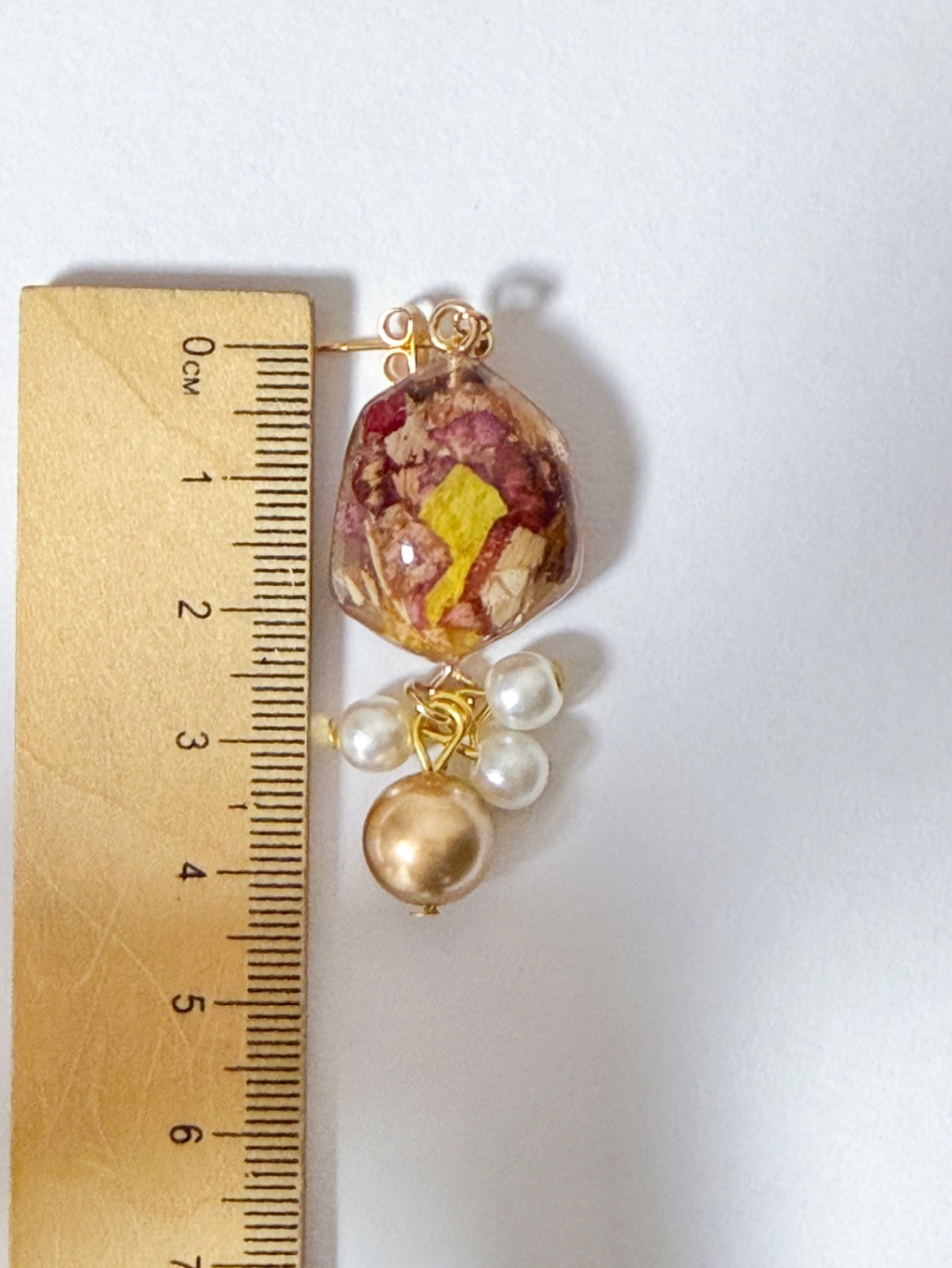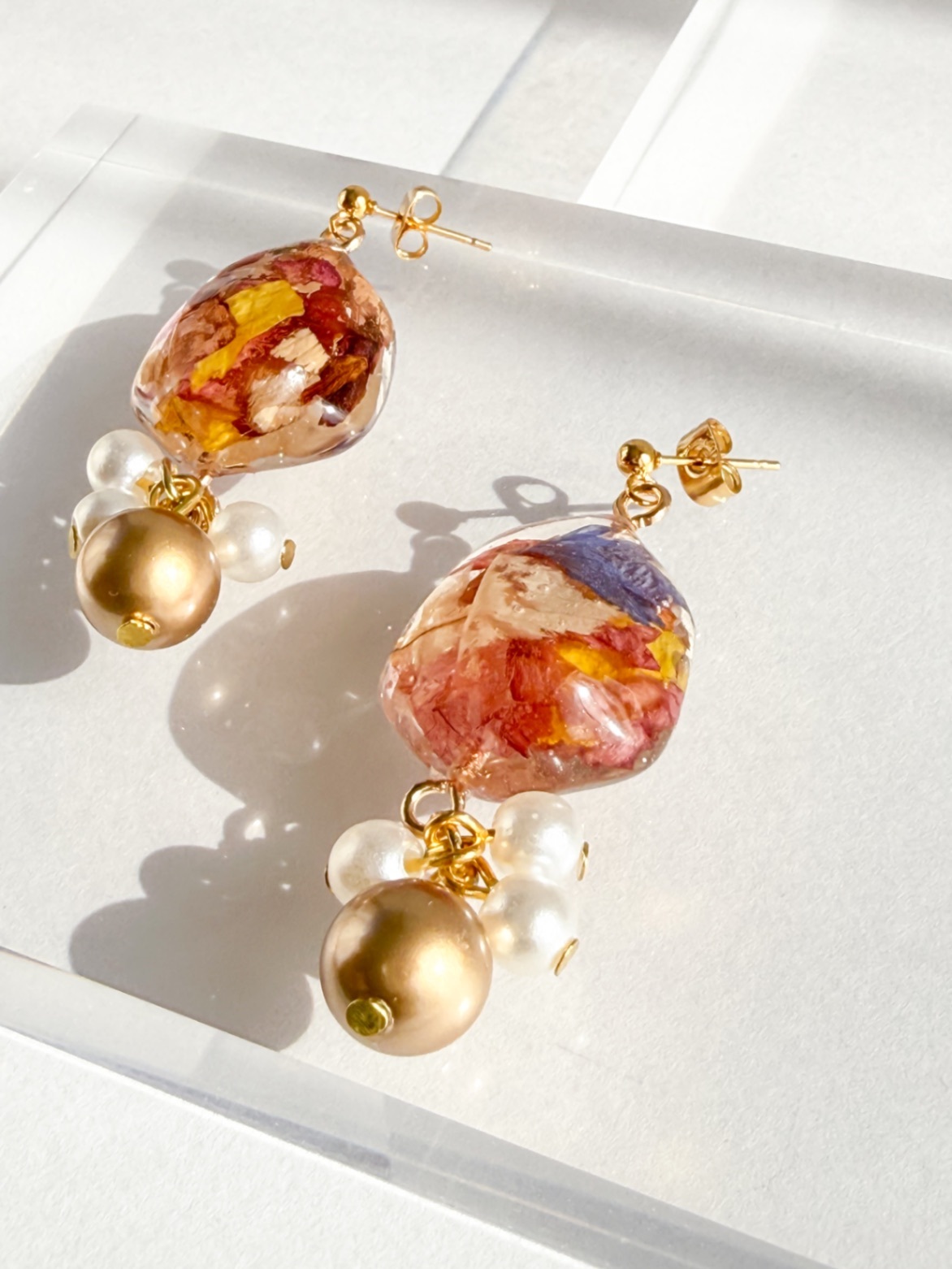 時間の経過とともにアンティークカラーへと変化したドライフラワーを、透明感のあるレジンに閉じ込めた鉱石風ピアスです。