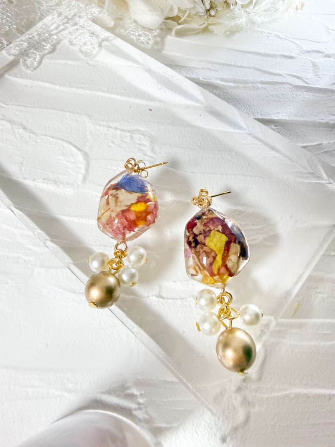 【ハンドメイド】アンティーク花びらのピアス 鉱石大― ドライフラワーを閉じ込めた透明感アクセサリー