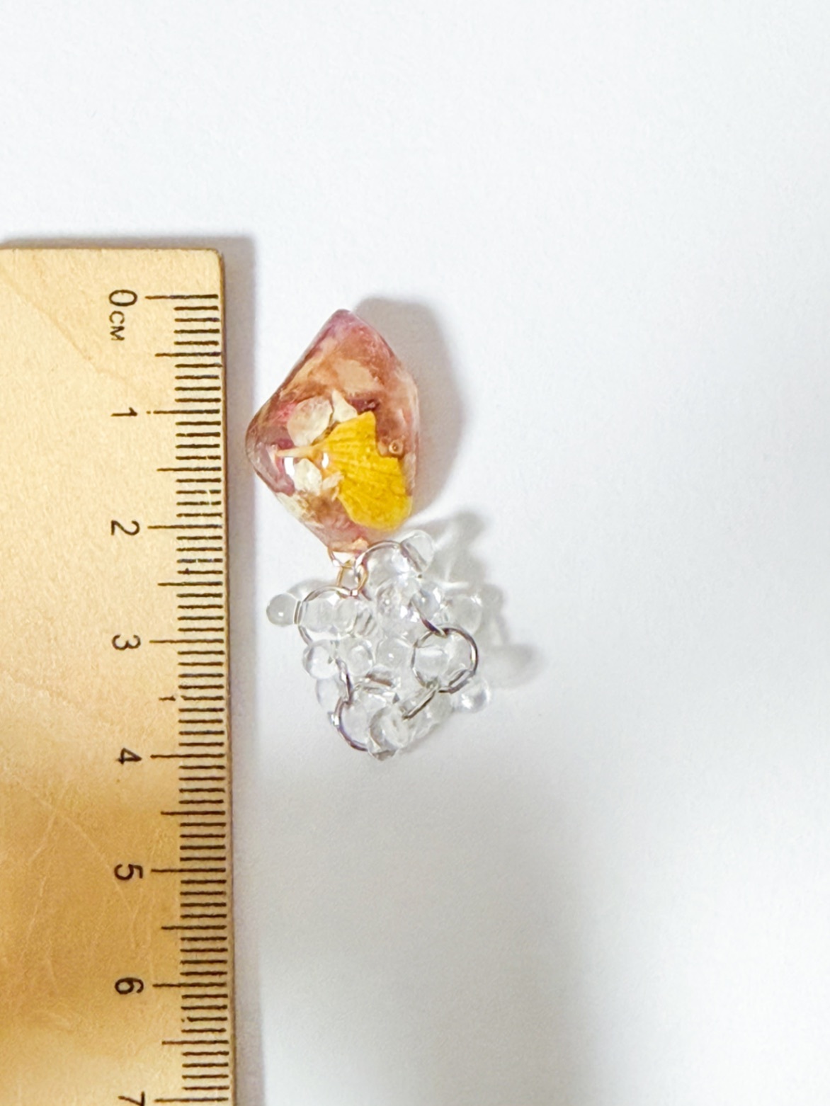 時間の経過とともにアンティークカラーへと変化したドライフラワーを、透明感のあるレジンに閉じ込めた鉱石風ピアスです。