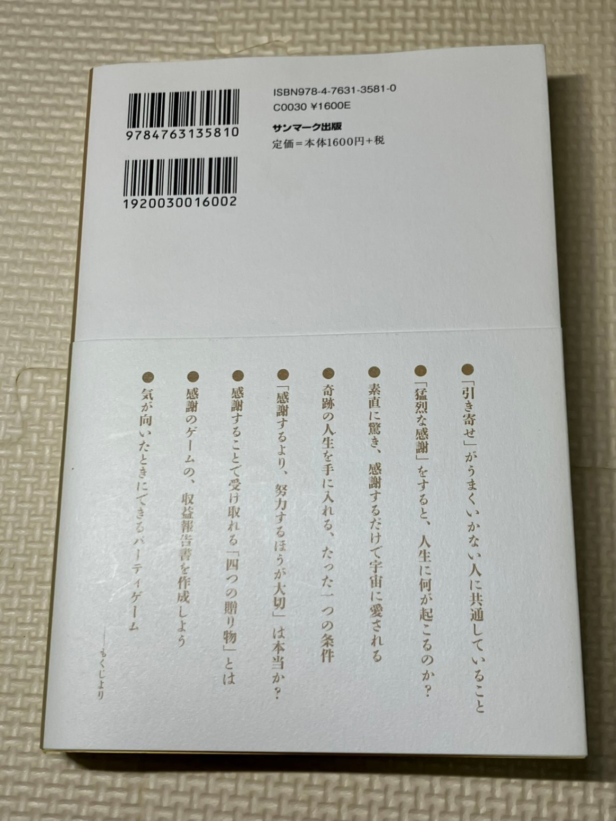 ・「猛烈な感謝」をすることで、感謝の周波数に乗り、宇宙とつながり奇跡が起こるエネルギーを受け取れることを説く。日常のあらゆる物事に感謝する実践が大事。