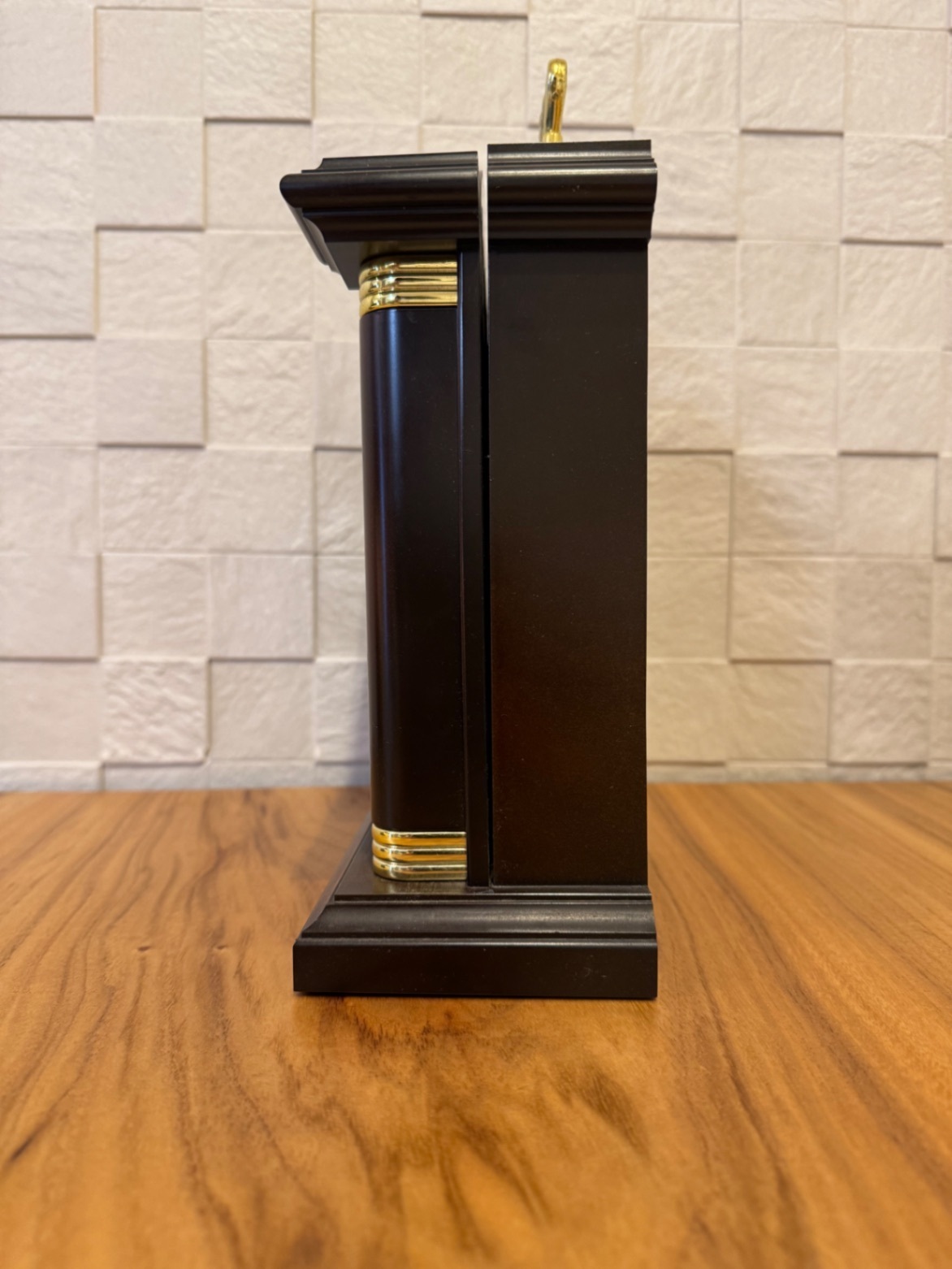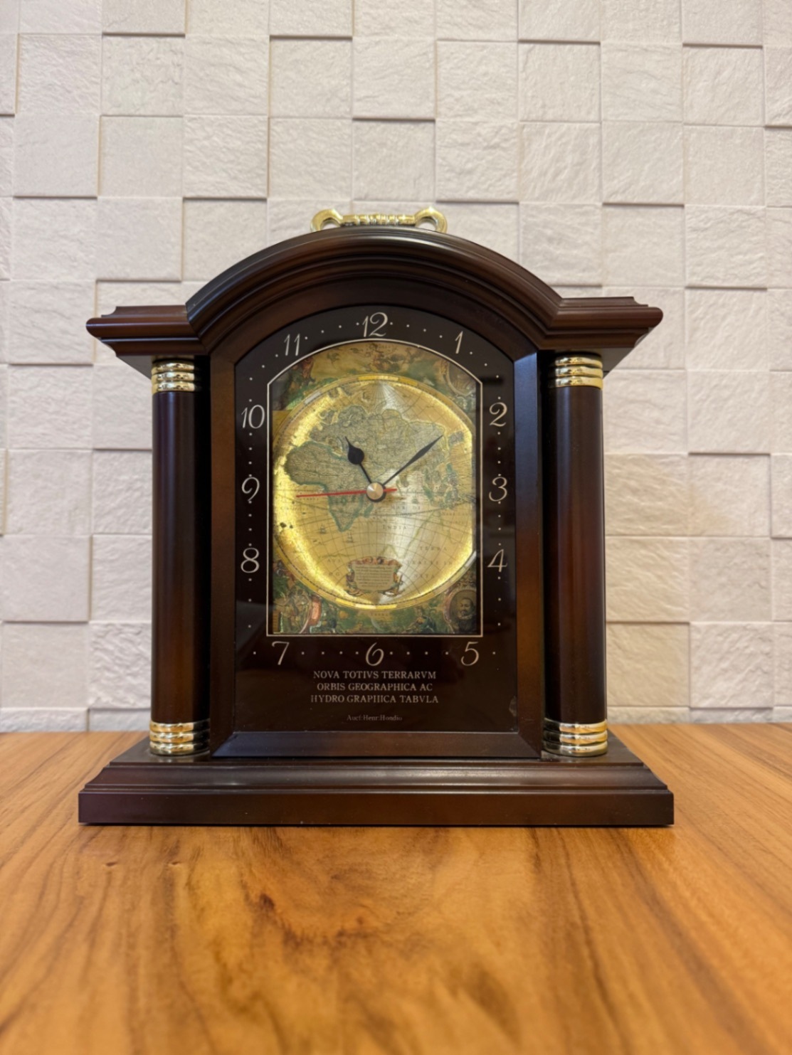クラシカルな世界地図デザインの文字盤が映えるアンティーク調の置き時計です。