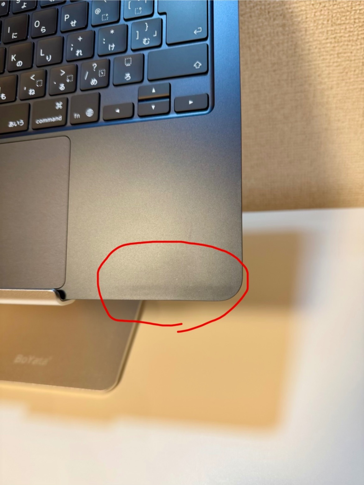 ・本体右側のパームレスト部分に、クリーニングしても取れない薄いシミのようなものがあります