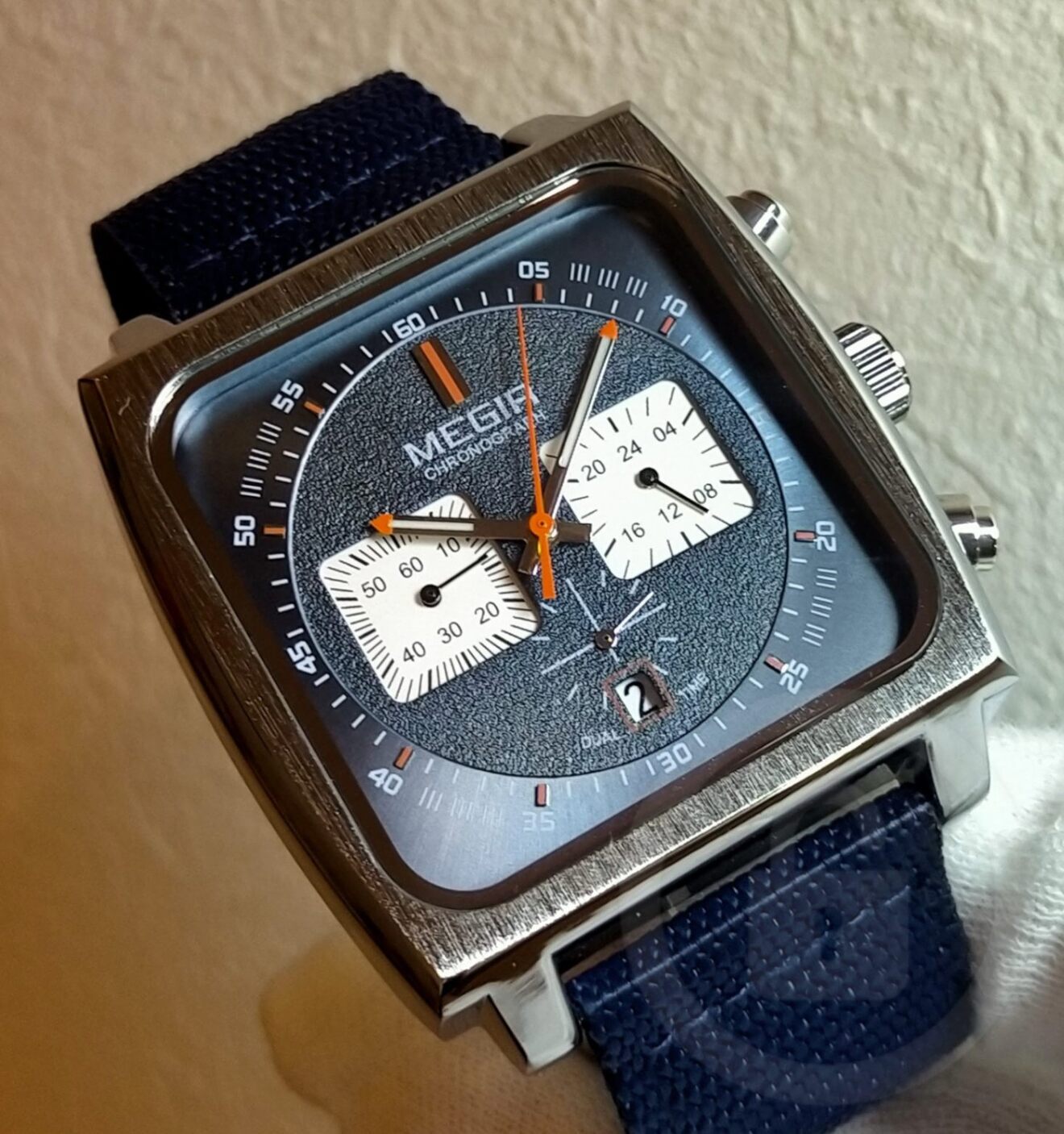 際立った四隅のエッジにより力強さを感じるスクエアスタイルに計器類を想起させる3インダイヤル様式のクロノグラフを搭載。