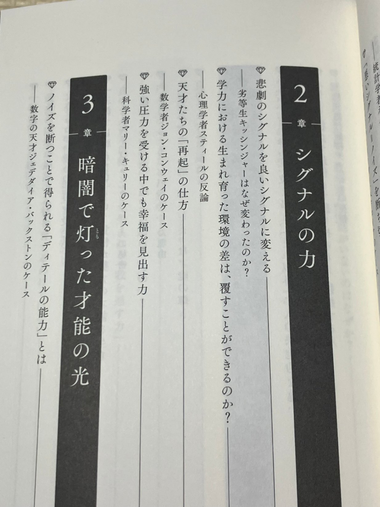 ・親・学校・社会などから来る無数のシグナルの中から、人生を豊かにする「本物のシグナル」を選び、邪魔な「ノイズ」(偏見や無駄な声)を断ち切る具体的な思考法と事例を古今東西から紹介。