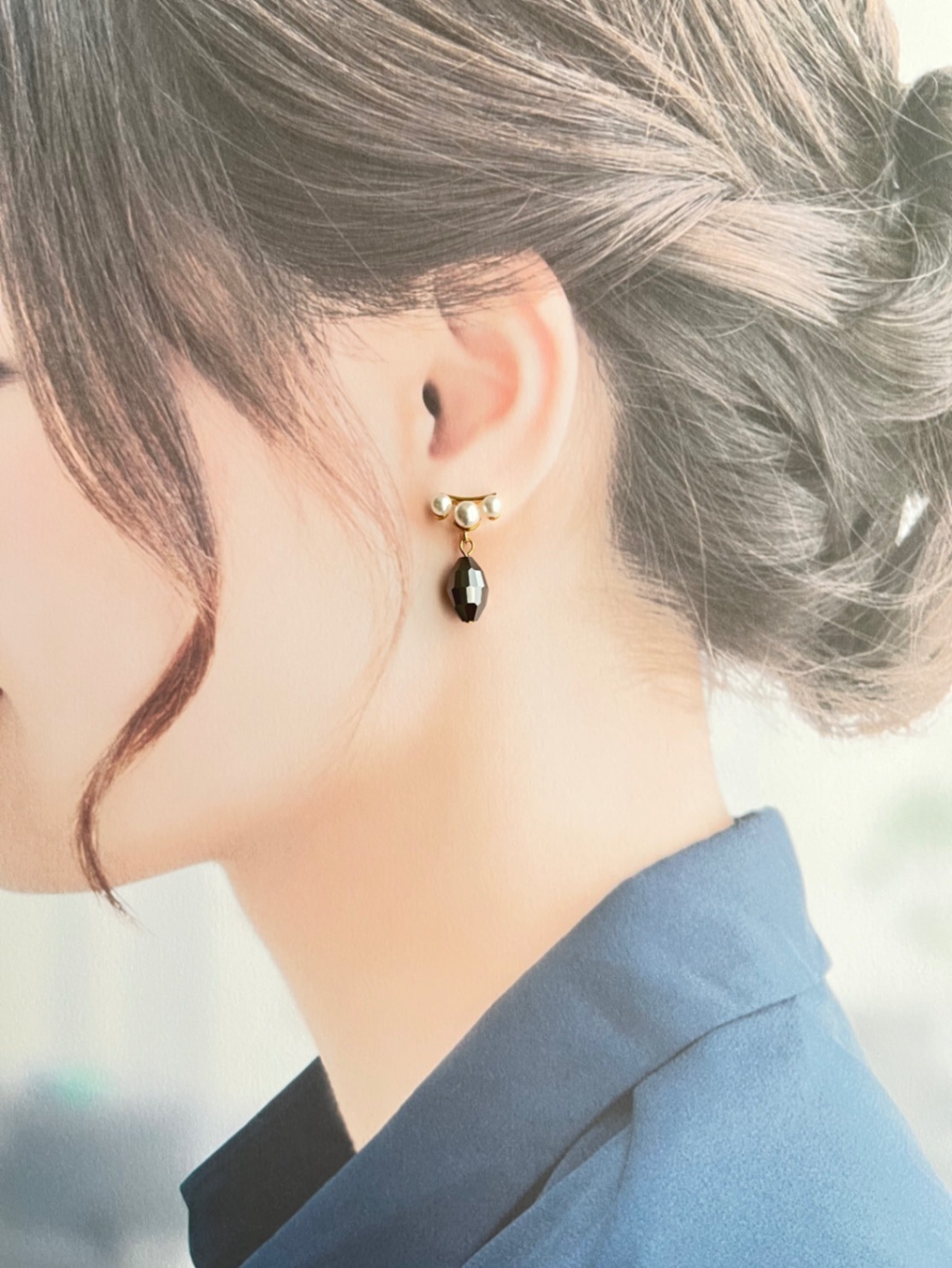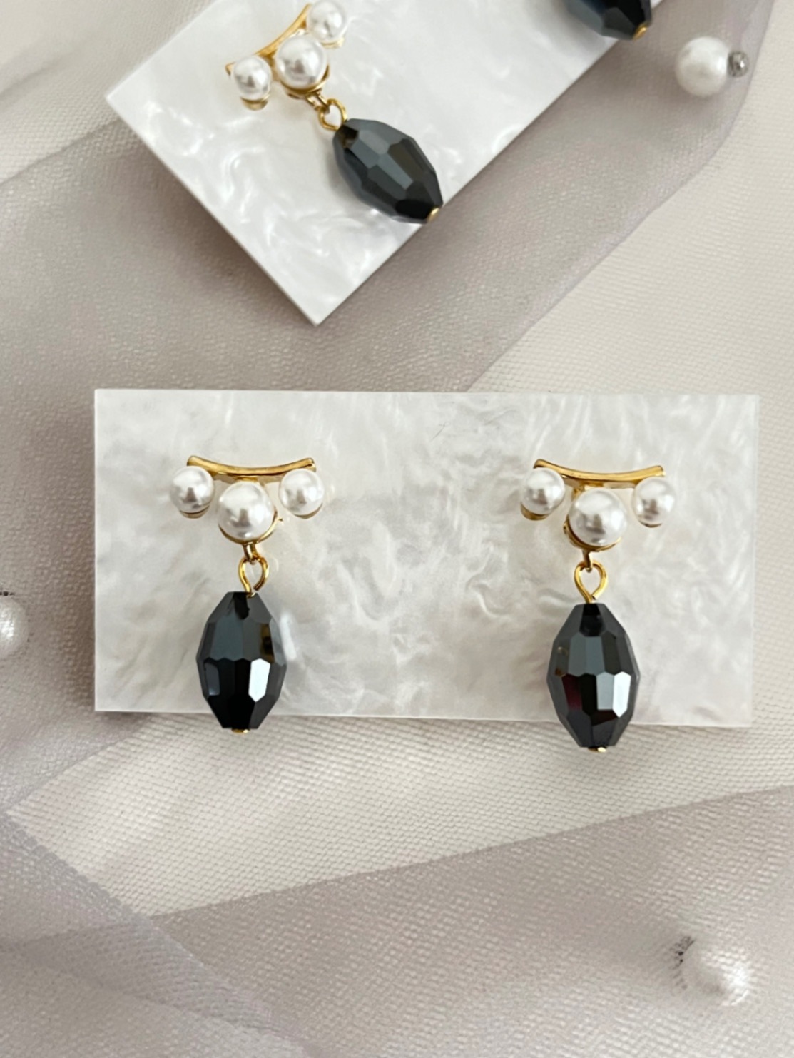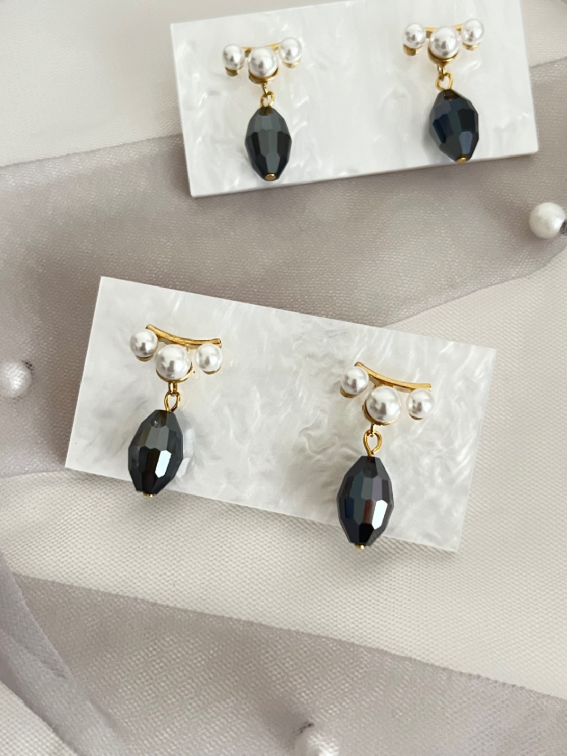 こちらの作品は3粒パールの付いたデザインポストにヘマタイト色のヴィンテージスワロフスキーを合わせたピアスです。