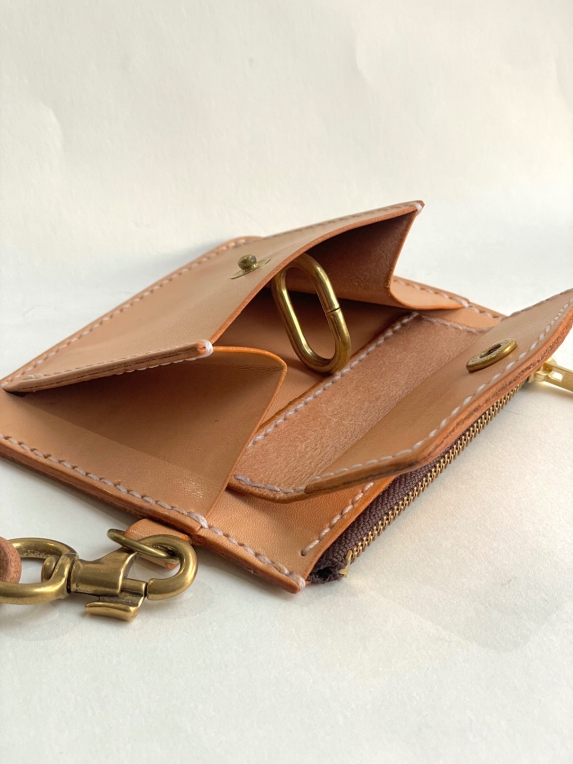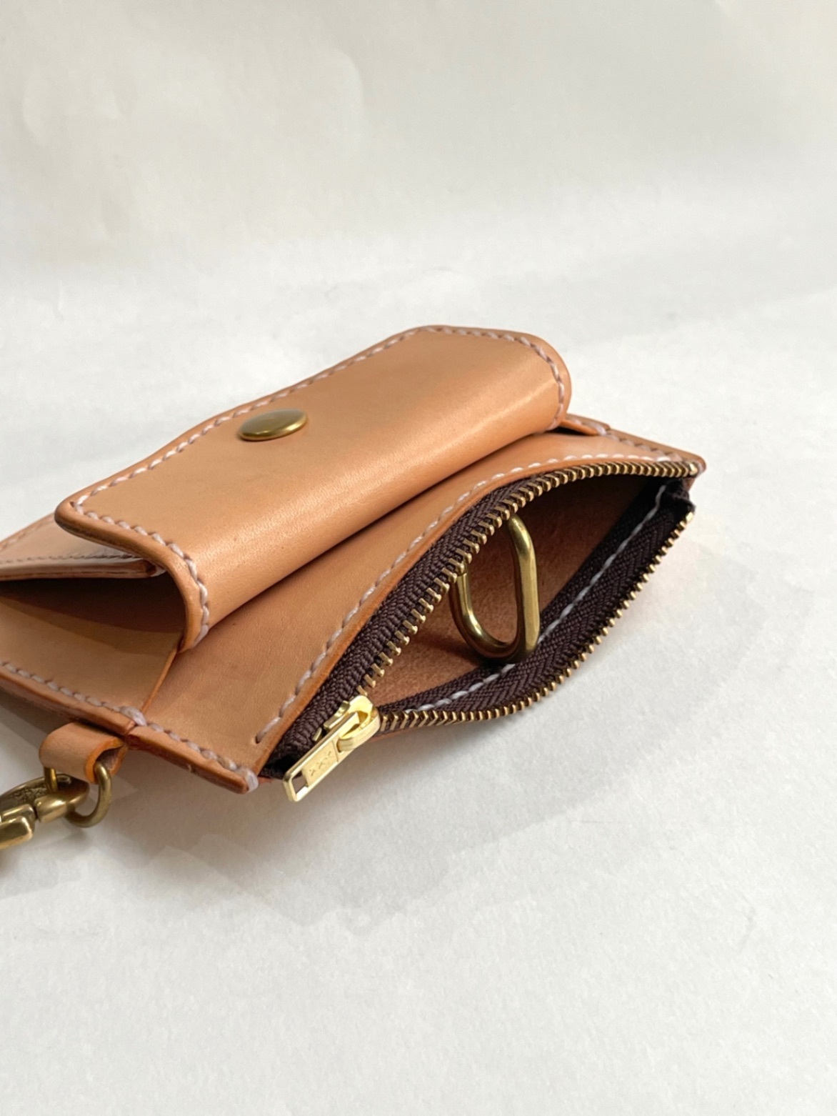 前面には真鍮製スナップボタン付きのコインポケットを配置し、