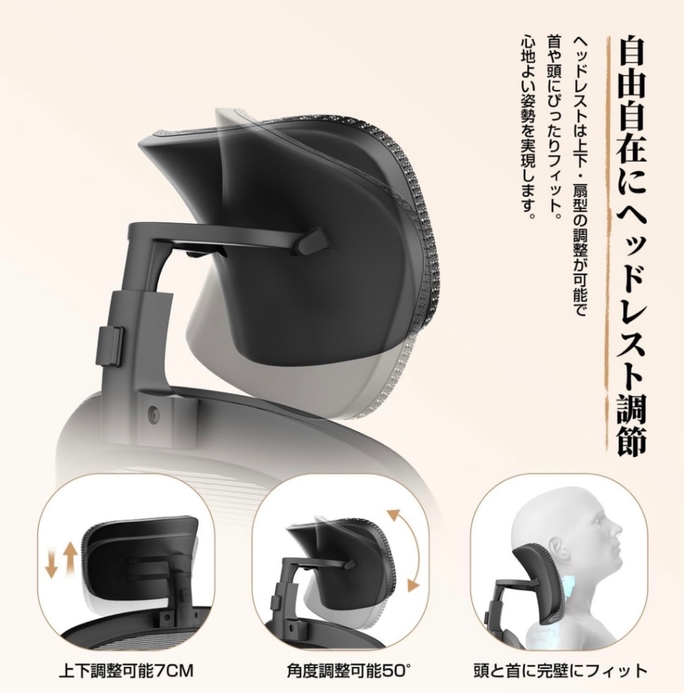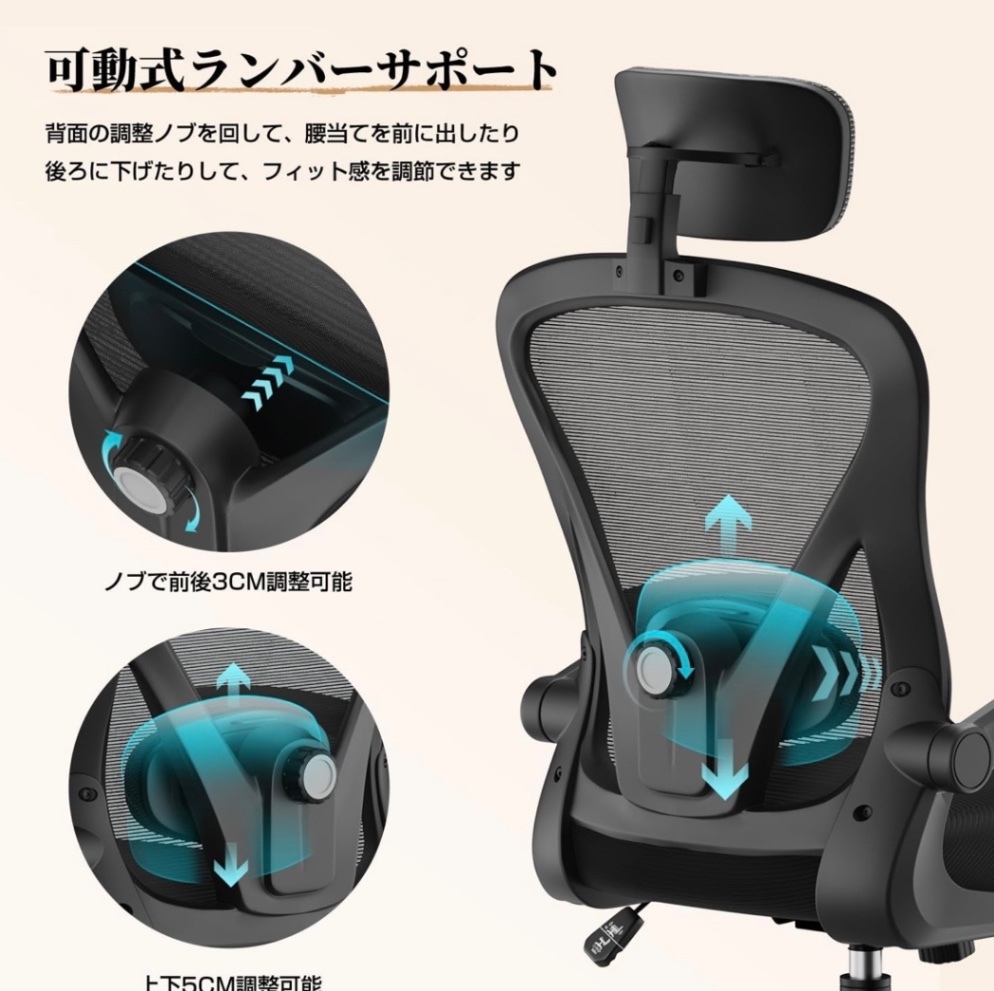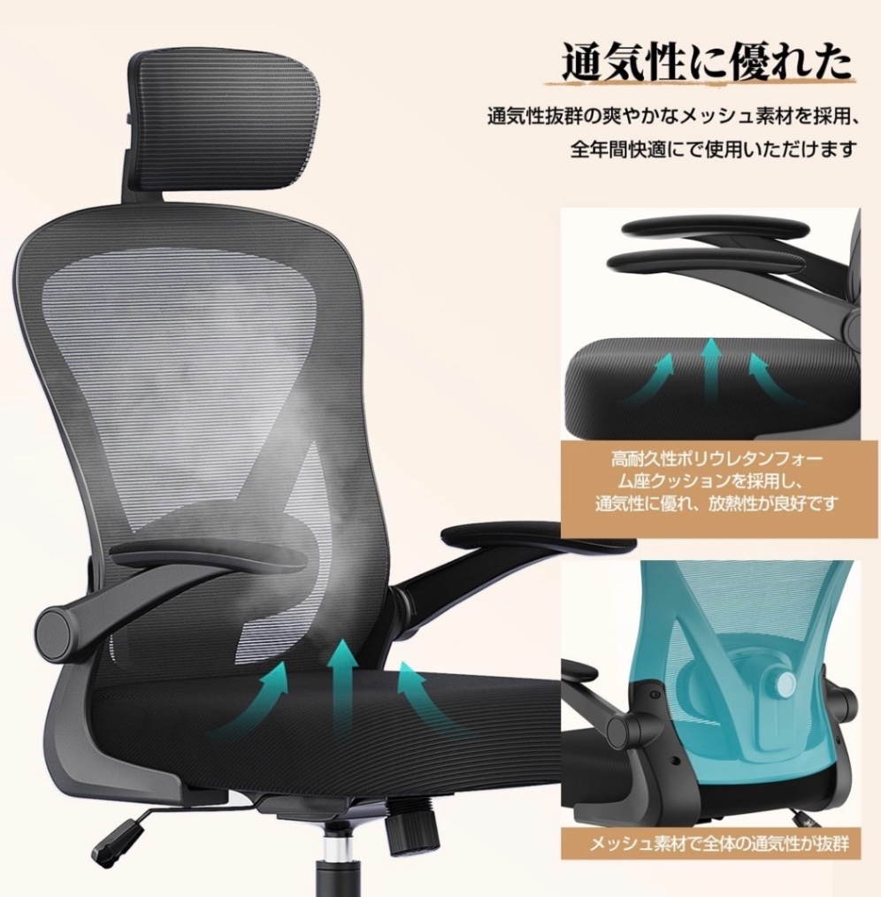 組み立ては必要になりますが、ムレにくいメッシュ素材、アームレスト有り、静音キャスター等その他色々と機能があるようです。