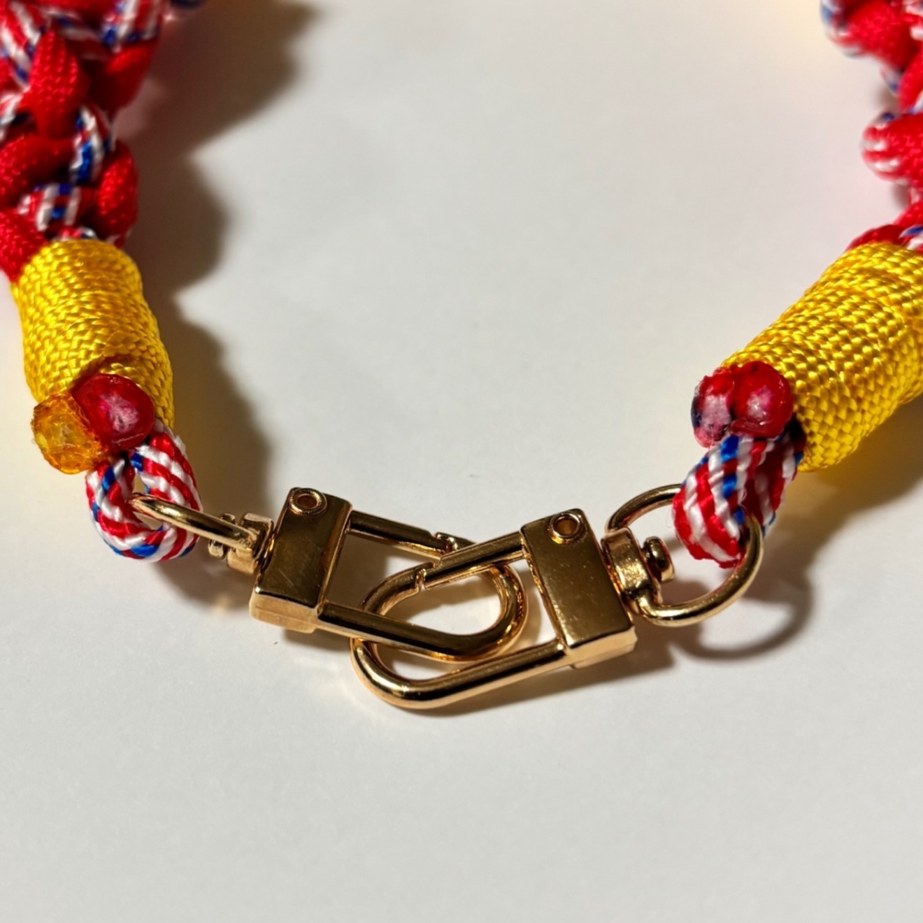 鮮やかなレッドとイエロー、そして爽やかなトリコロールカラーを組み合わせたポップなデザインに仕上げました。ゴールドの金具を合わせているので、カジュアルすぎず上品な雰囲気もあります。