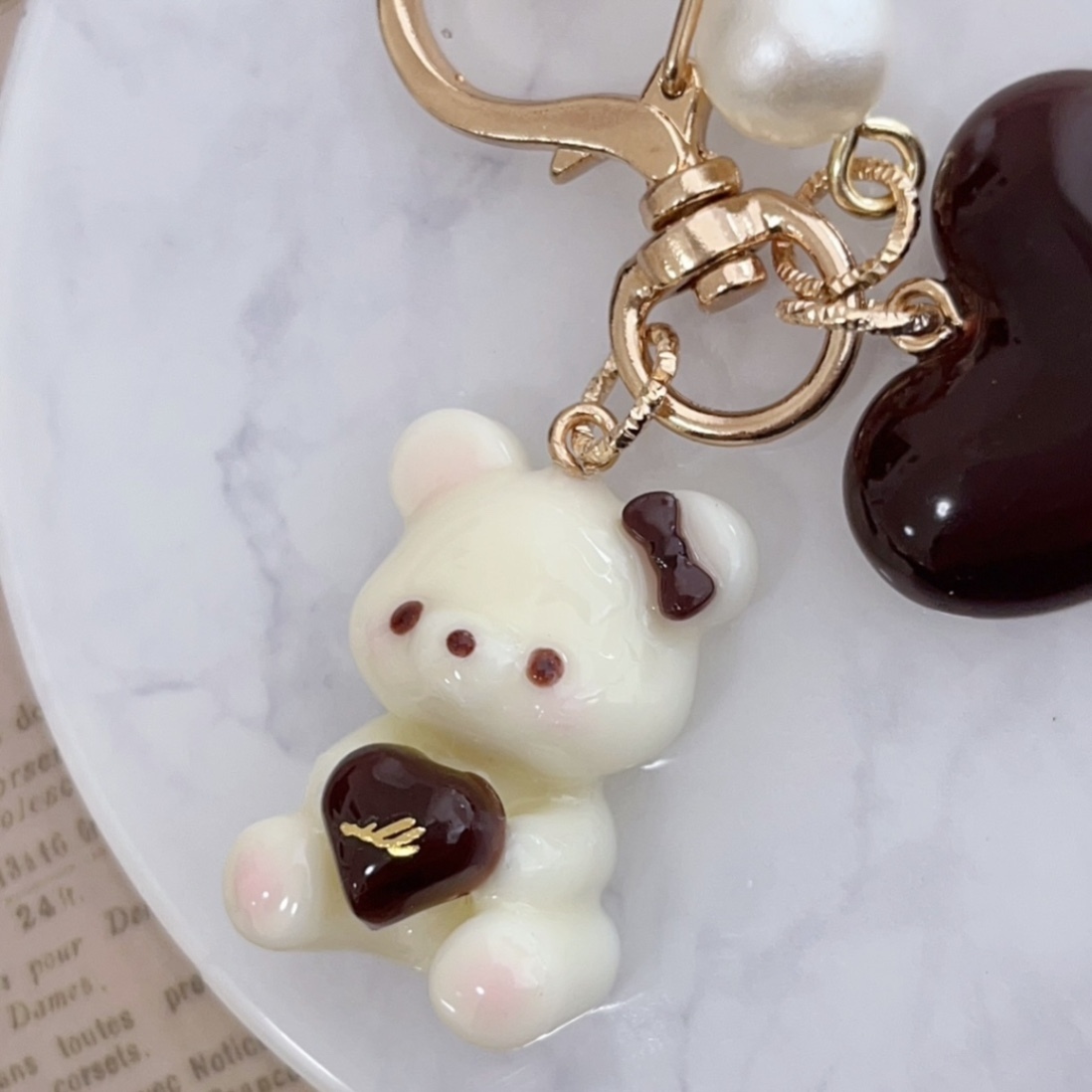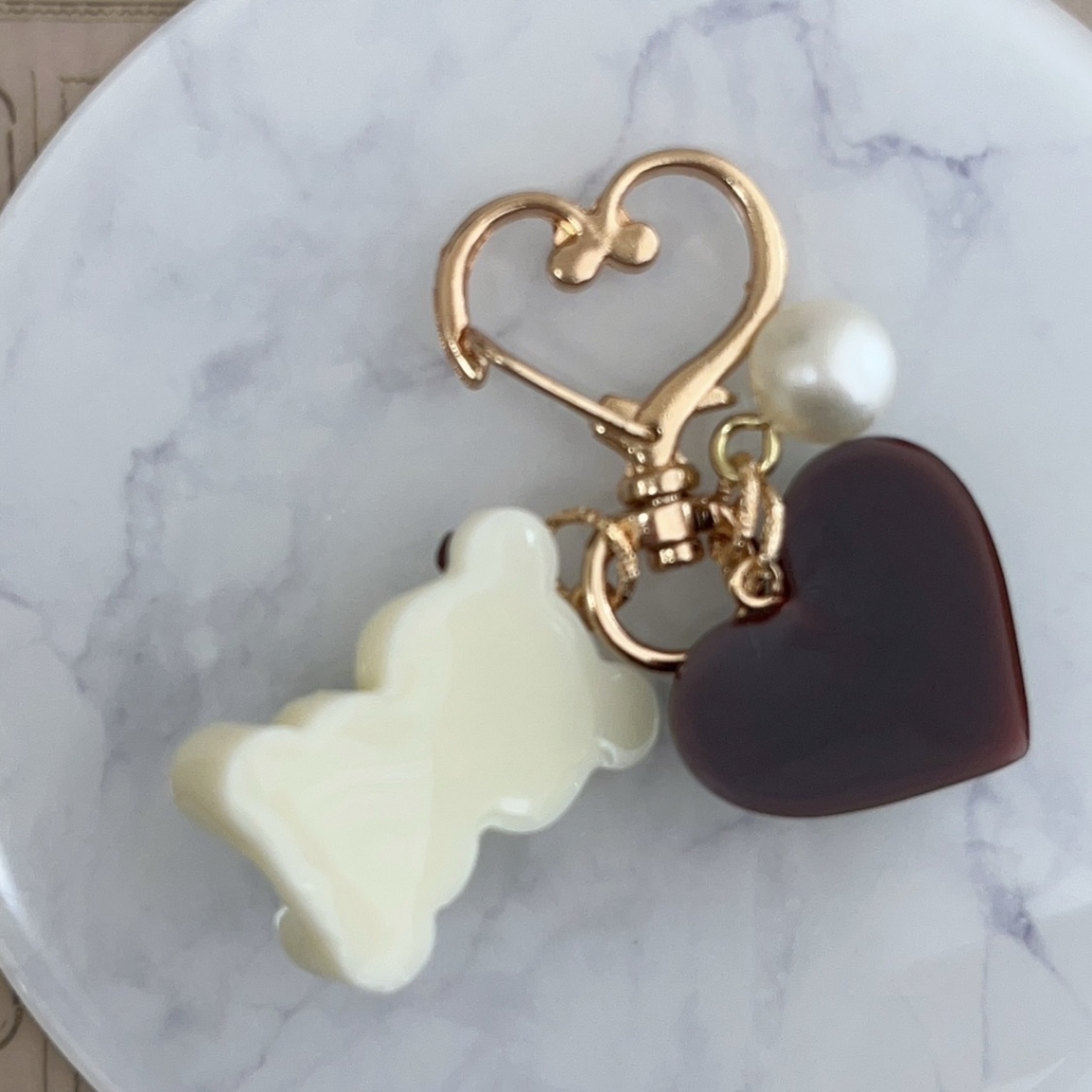 チョコレートを抱えたくまさんと、つやつやのハートチャームがポイント✨