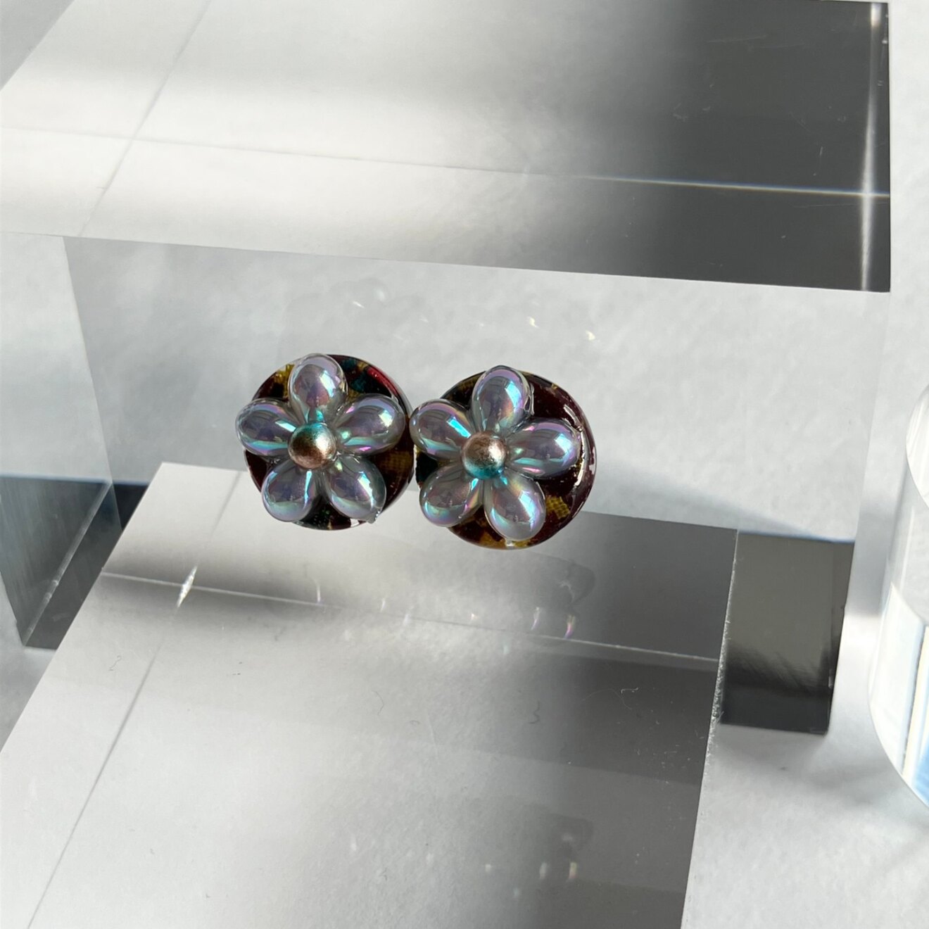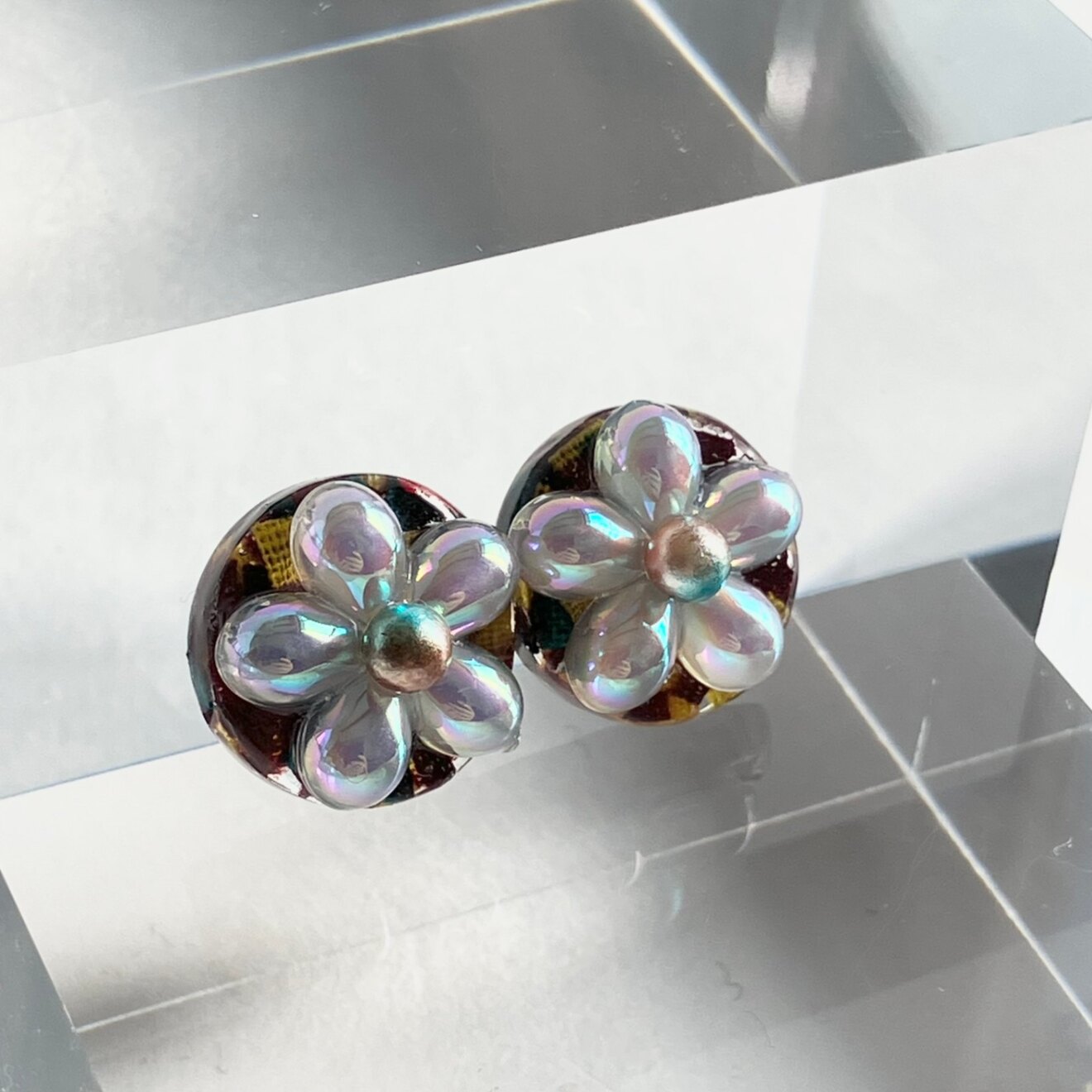 【べっ甲カラー】アフリカ布のハギレとキラキラお花を使った光を纏うイヤーアクセサリー(選べる金具)