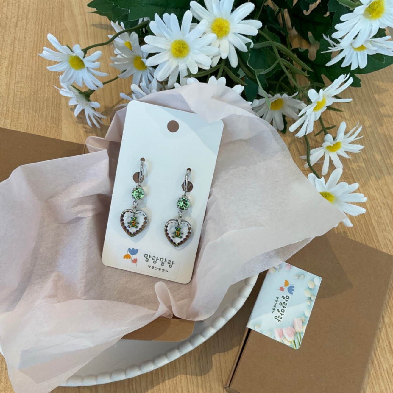 透明感あふれるハート型のドイツ製ガラスに、小さなテディベアを閉じ込めた、遊び心と上品さを併せ持つピアスです。