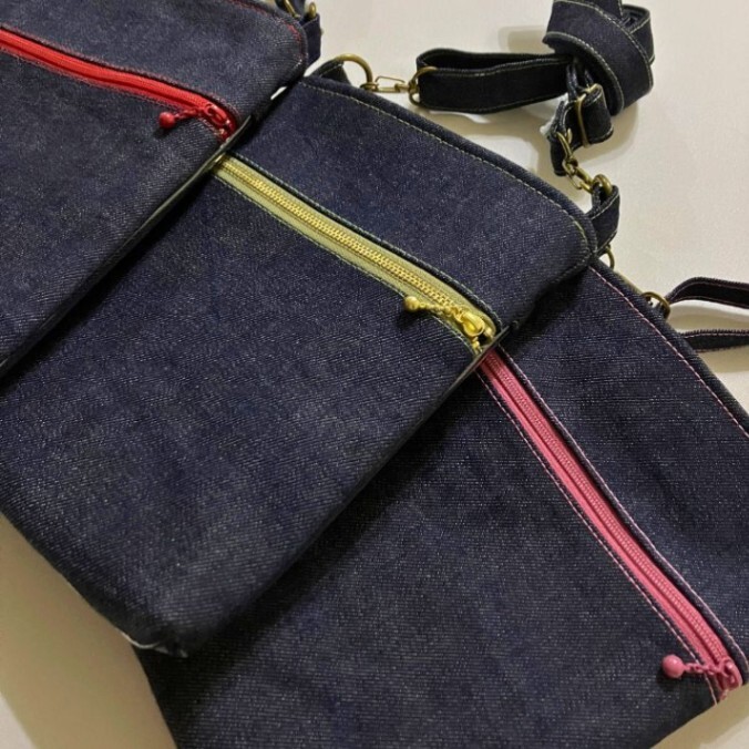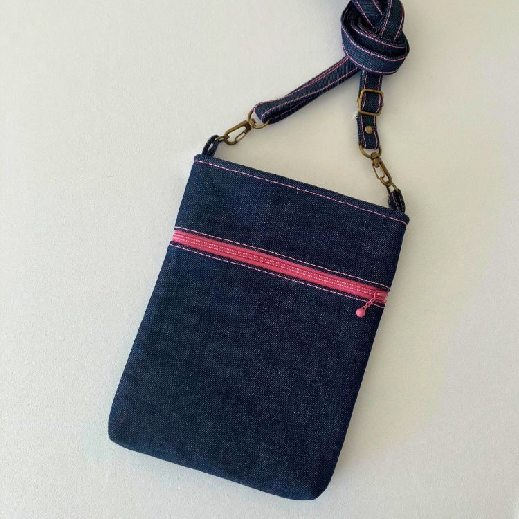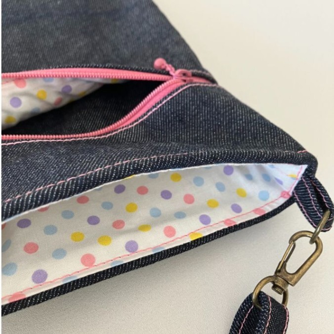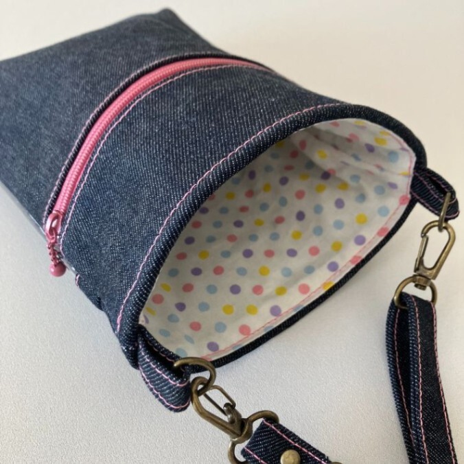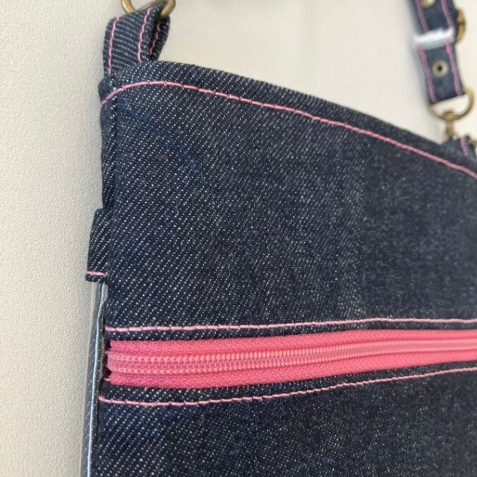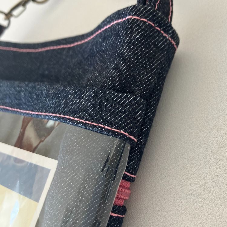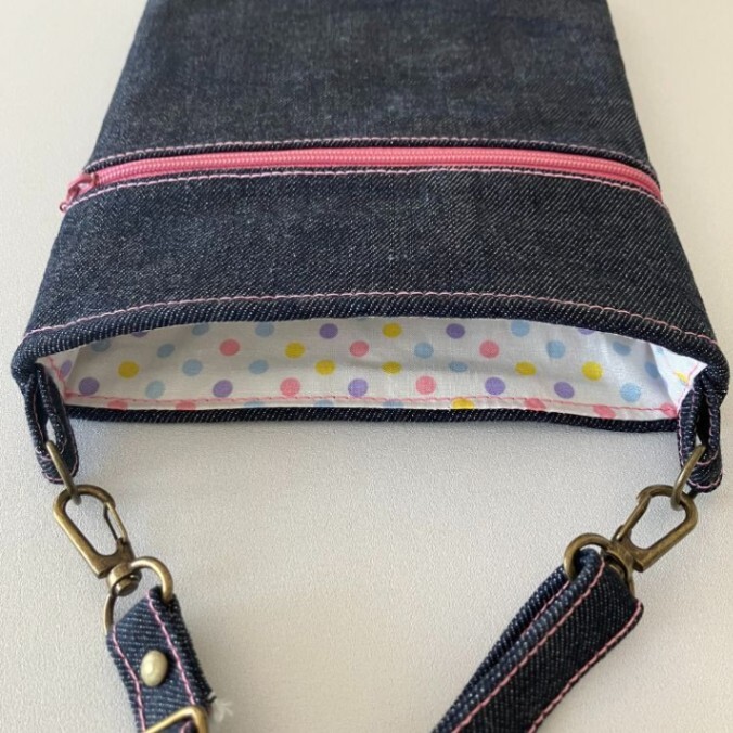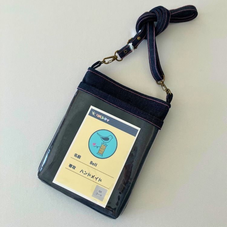 デニム生地にピンクがアクセントの小物が入れられるショルダータイプの名札ケースです