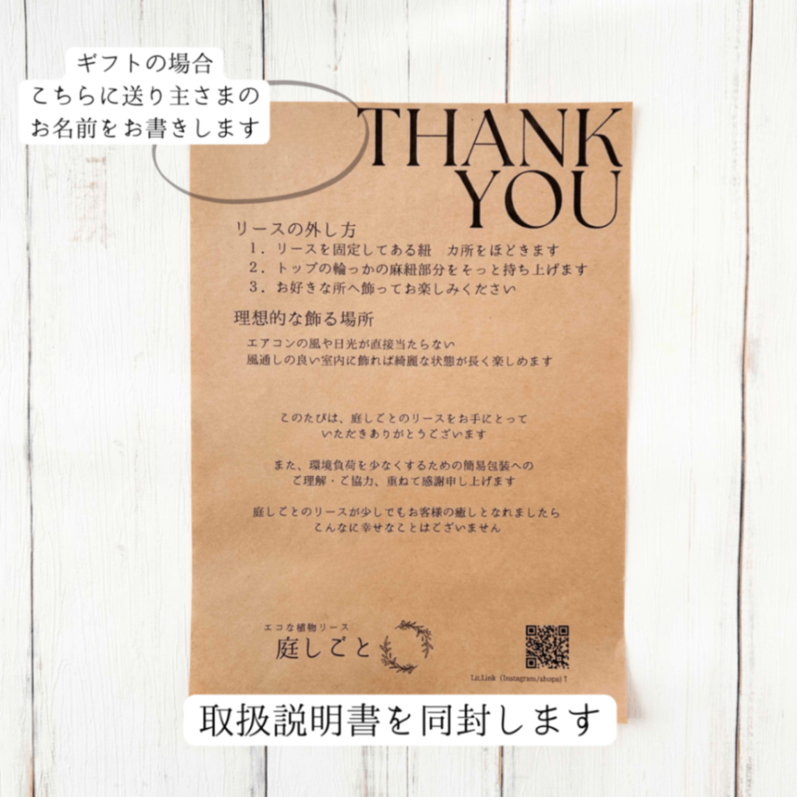 ・リースの取り扱い説明書に、送り主さまのお名前を記入します。