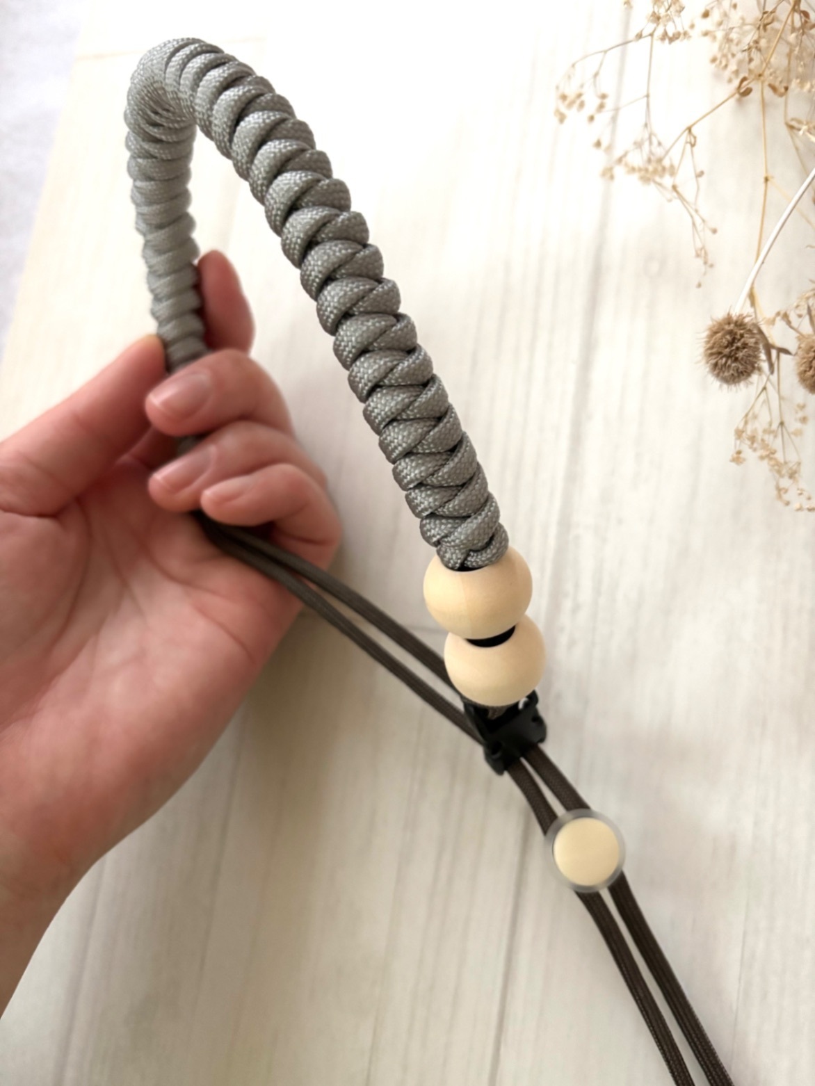 天然木のウッドビーズをあしらった、手に取るたびほっとするナチュラルなパラコードのドリンクホルダーです。