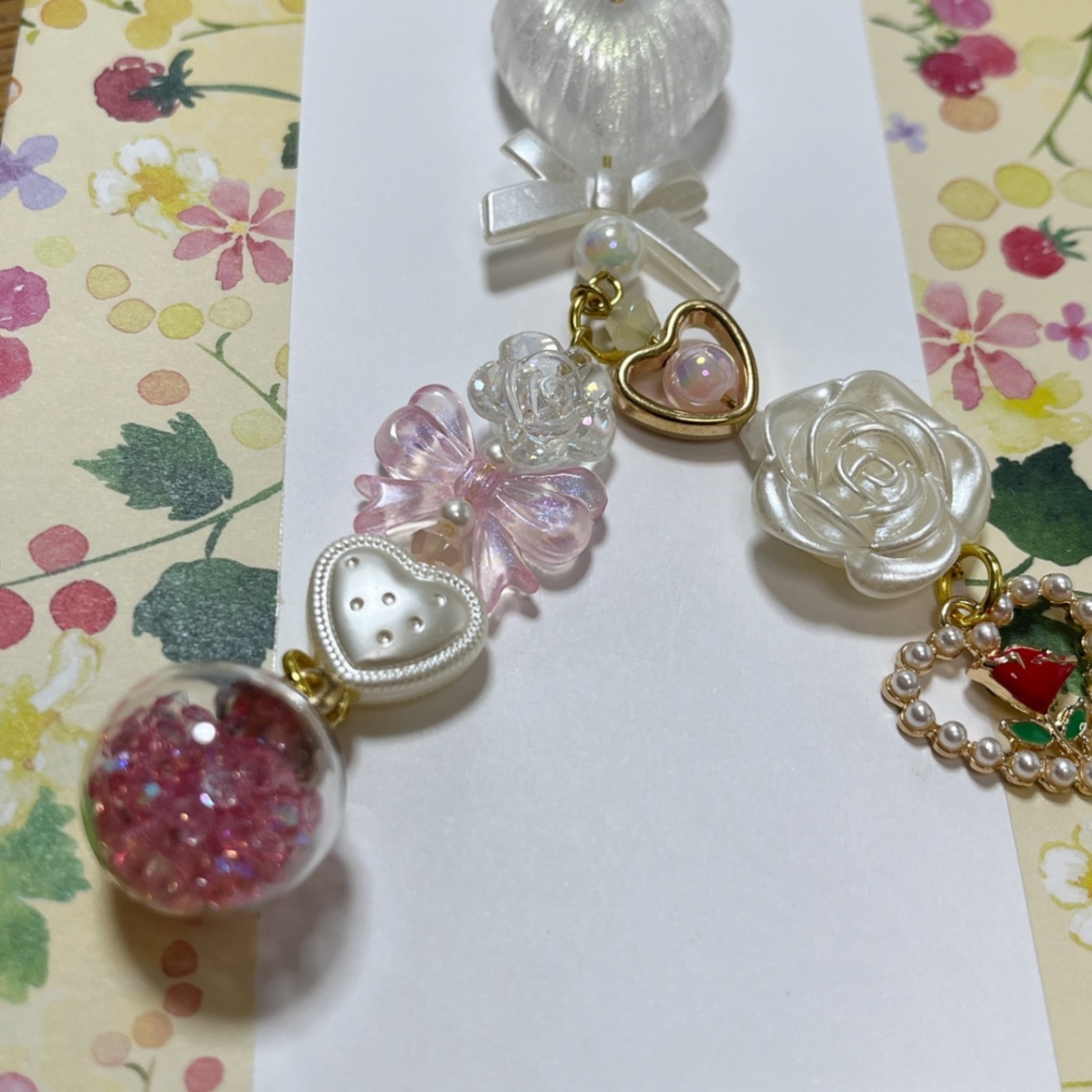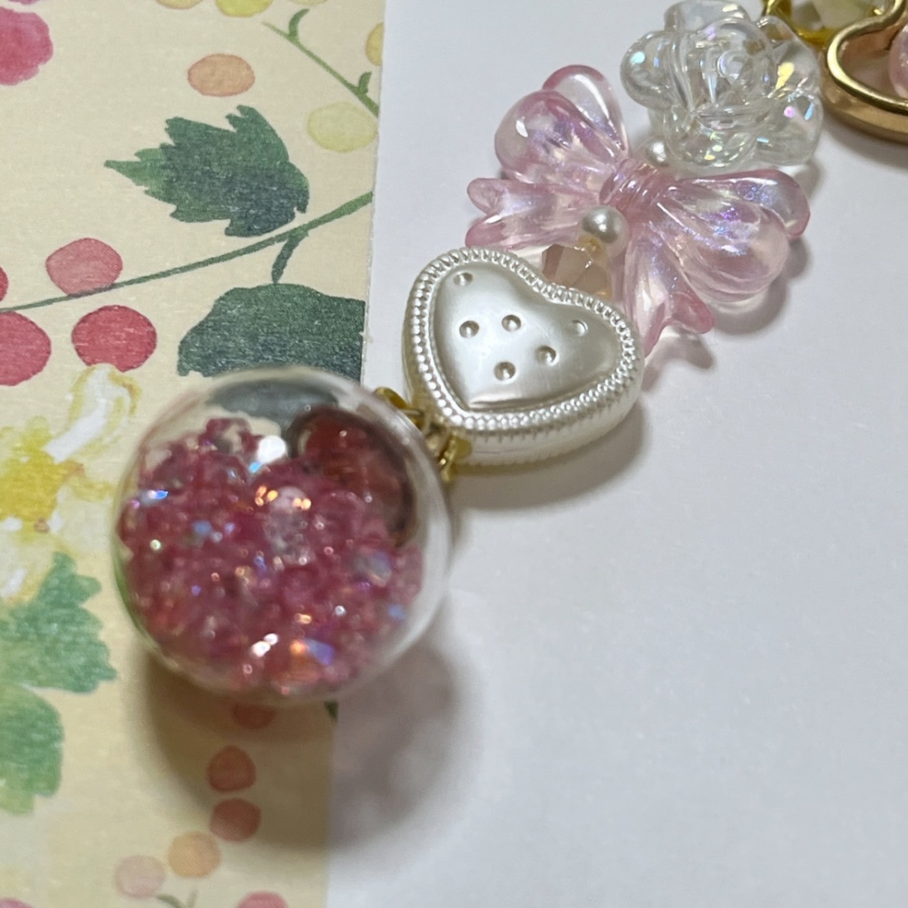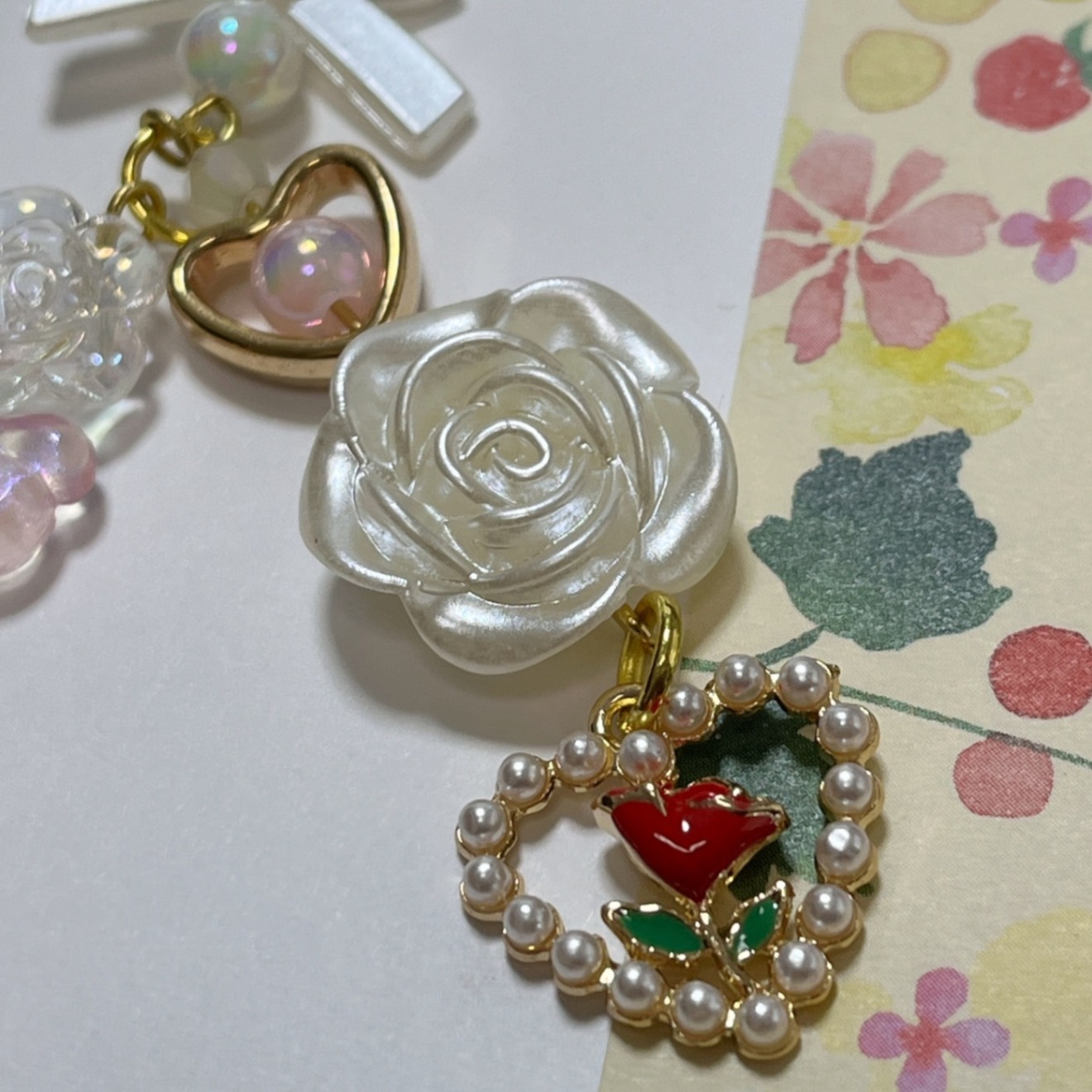 透明感のあるハートとローズを重ねたやさしくきらめくチャームキーホルダーです🤍推し活チャームにも!