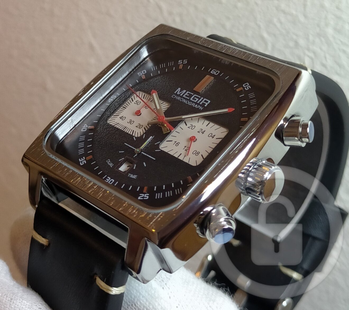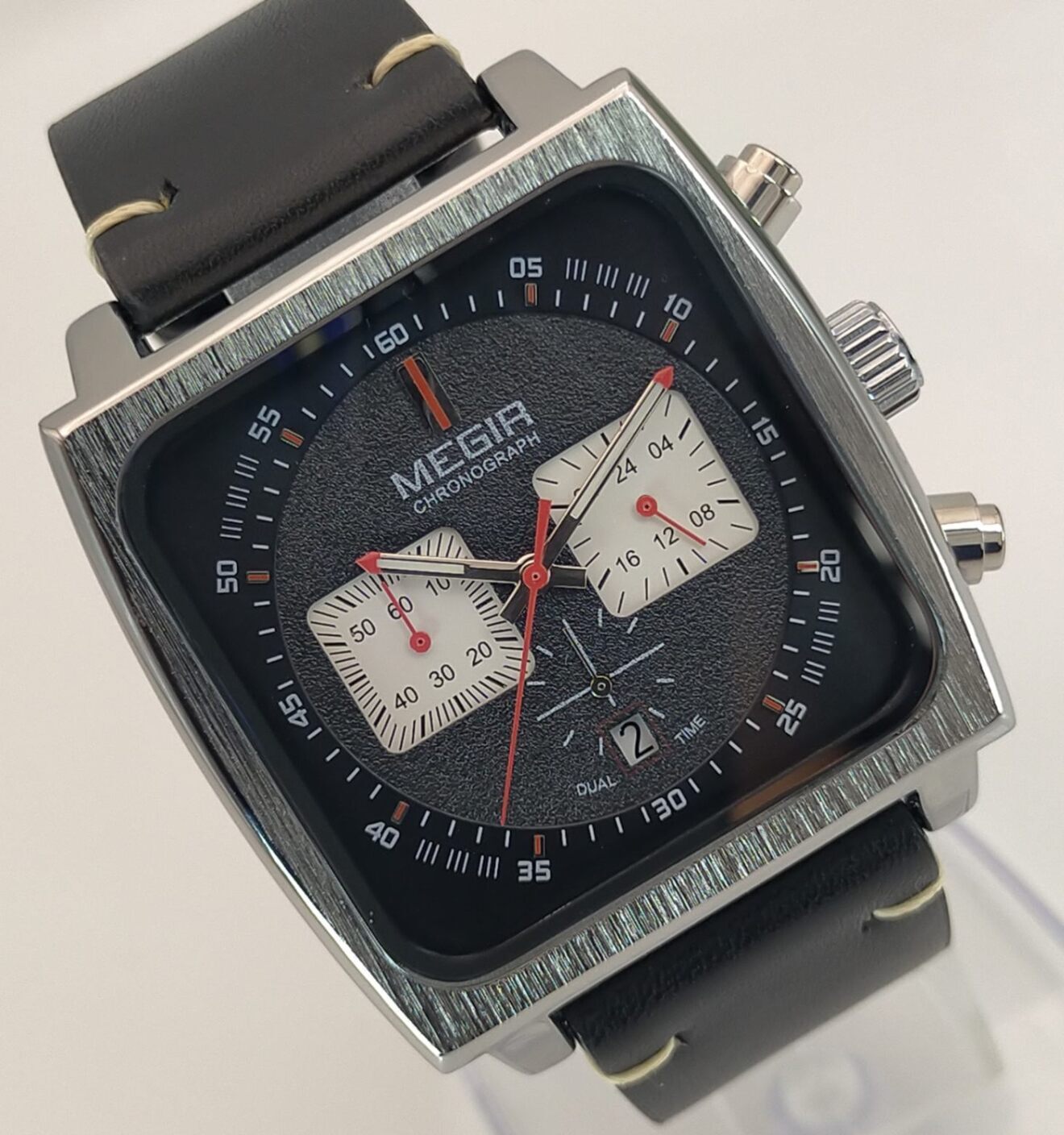 際立った四隅のエッジにより力強さを感じるスクエアスタイルに計器類を想起させる3インダイヤル様式のクロノグラフを搭載。