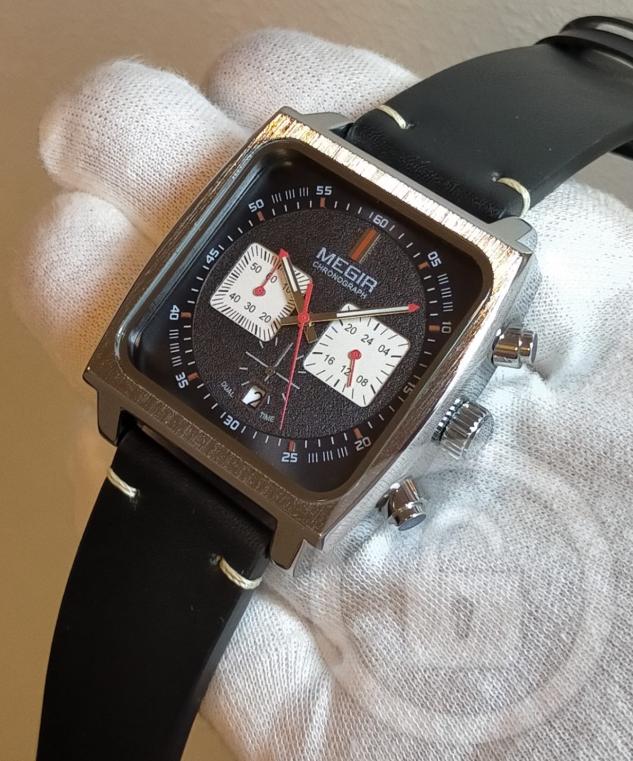 一方、力強さだけの大味モデルとは無縁。文字盤はスクエアながら、中央にはサンド仕上げされたラウンドエリアが設けられ、ホワイトインダイヤルによるスクエアパンダ仕様が洗練性も感じさせてくれます。