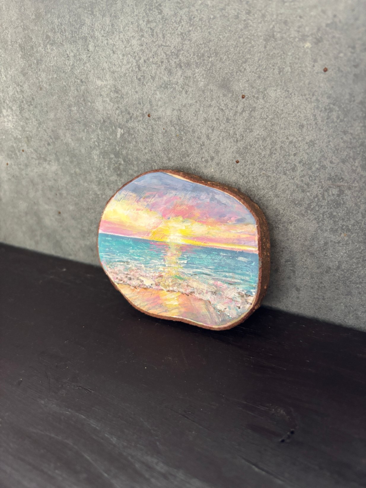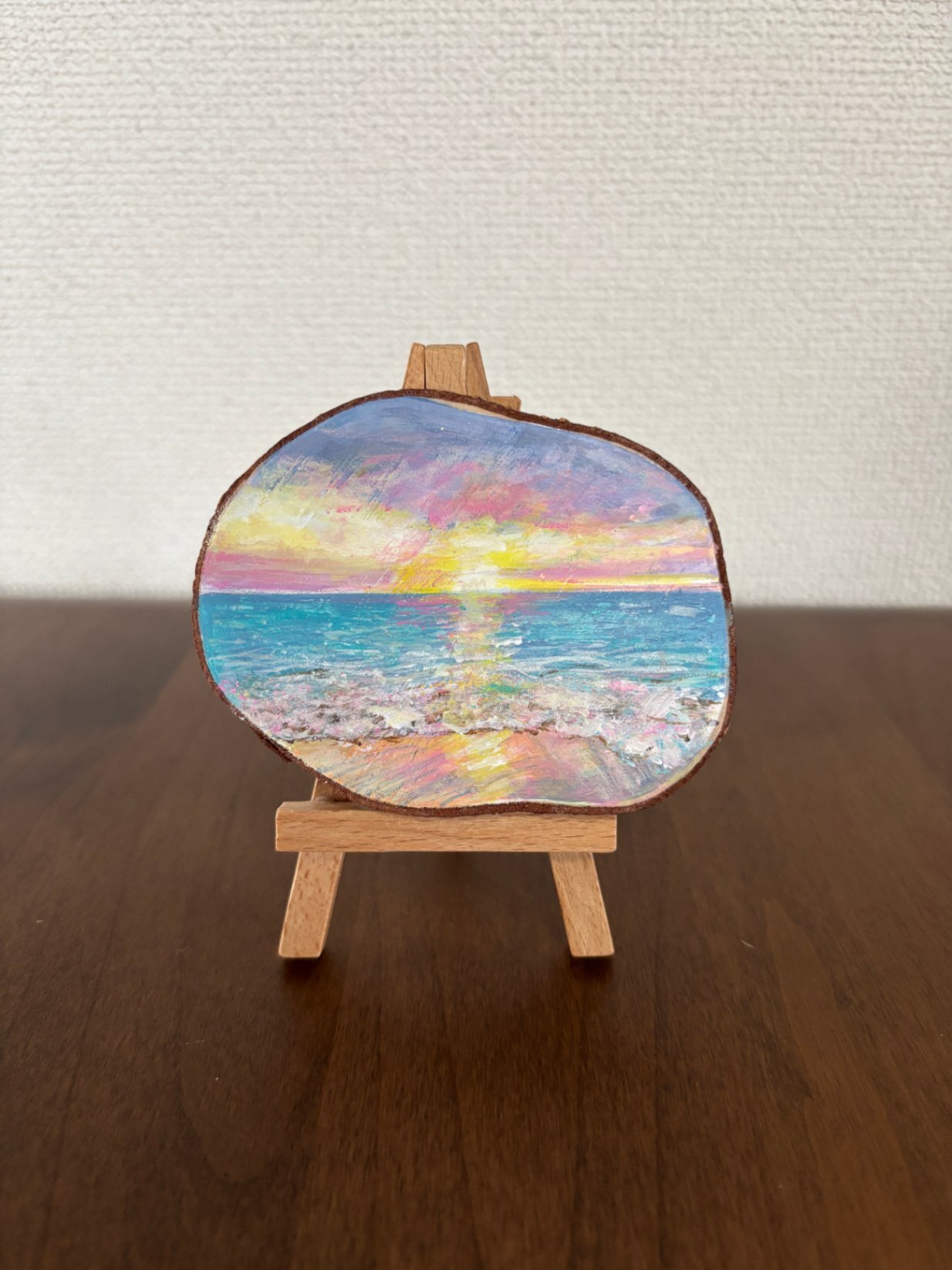 天然の木に描いたアクリル画です。