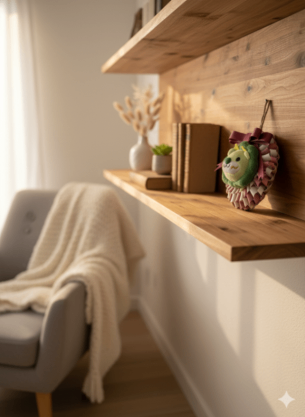 麻紐の安全ガード付きなので、ぬいぐるみをはめた後にナスカンで麻紐に固定すると、壁掛け時も安定します。