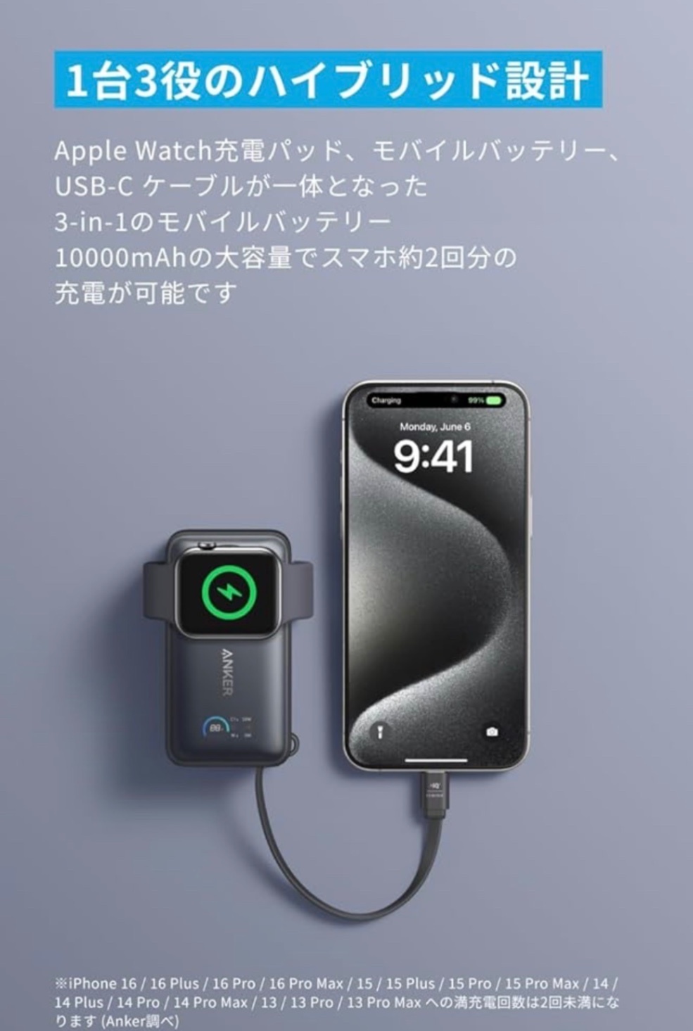 ・1台3役のハイブリッド設計:Apple Watch充電パッド、モバイルバッテリー、USB-C ケーブルが一体となった3-in-1のモバイルバッテリー。10000mAhの大容量でスマホ約2回分の充電が可能です。