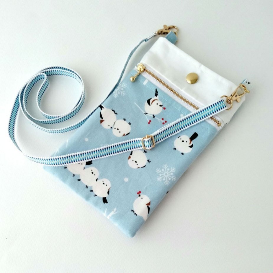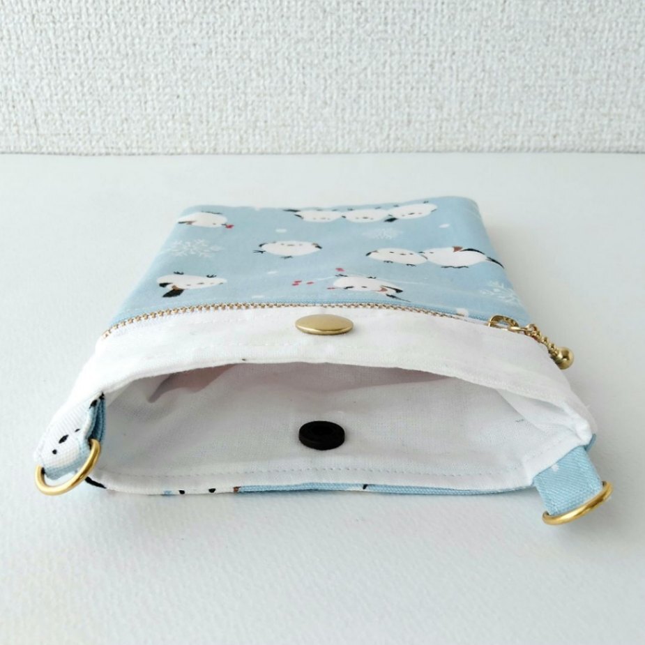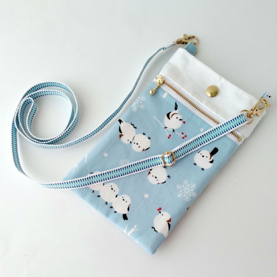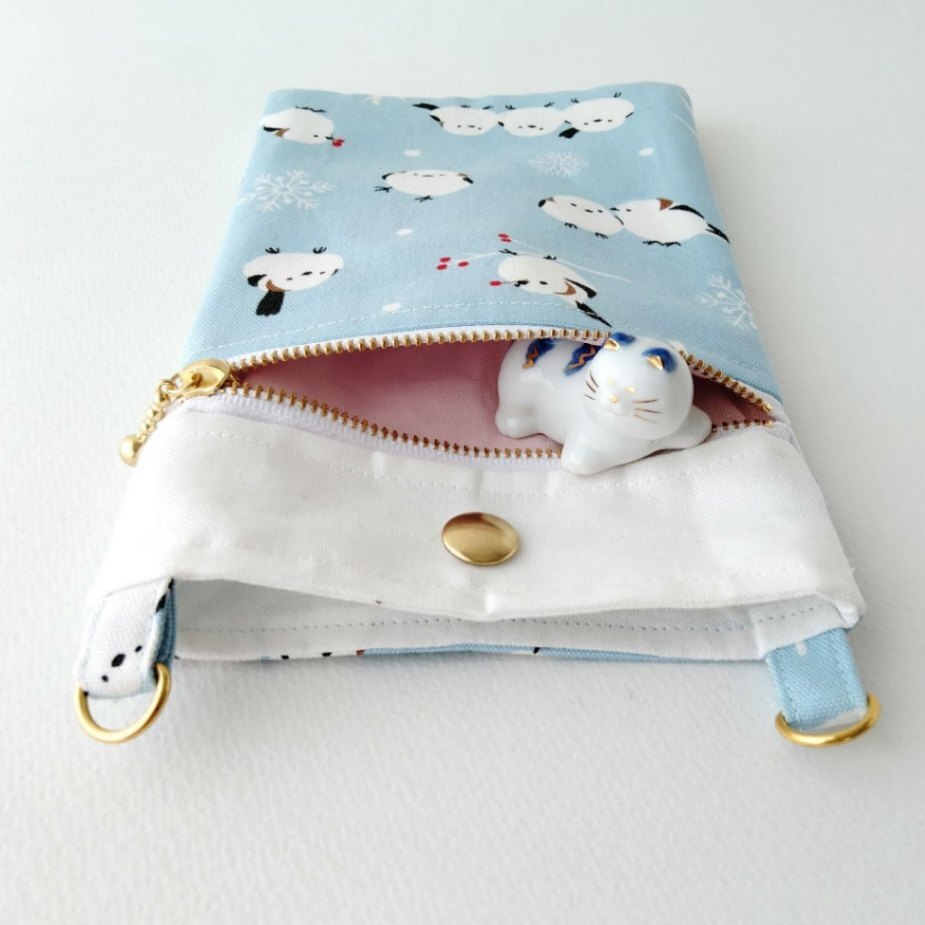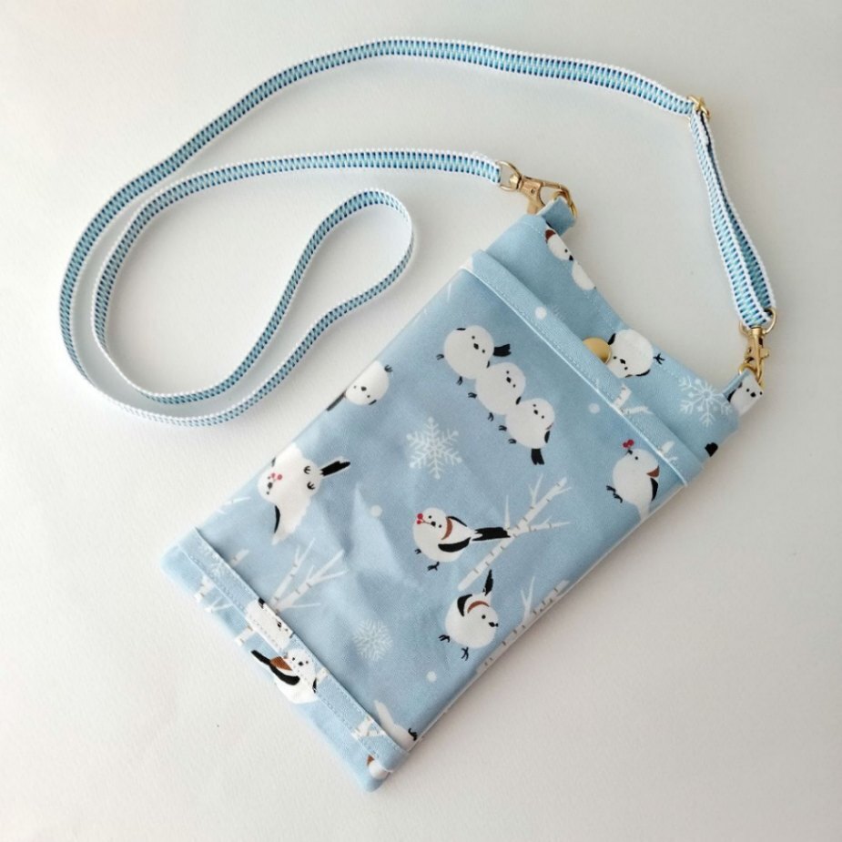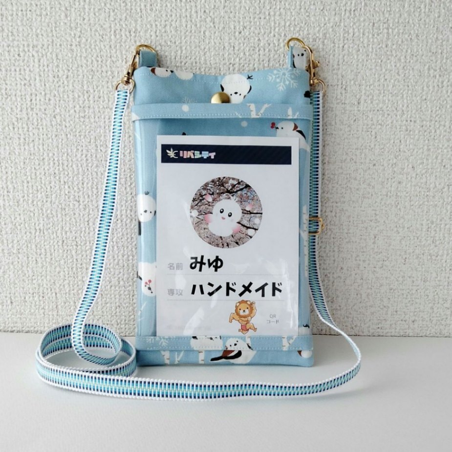 【真田紐のショルダー紐付き♪】雪景色・ライトブルーのシマエナガさん 名札ケース