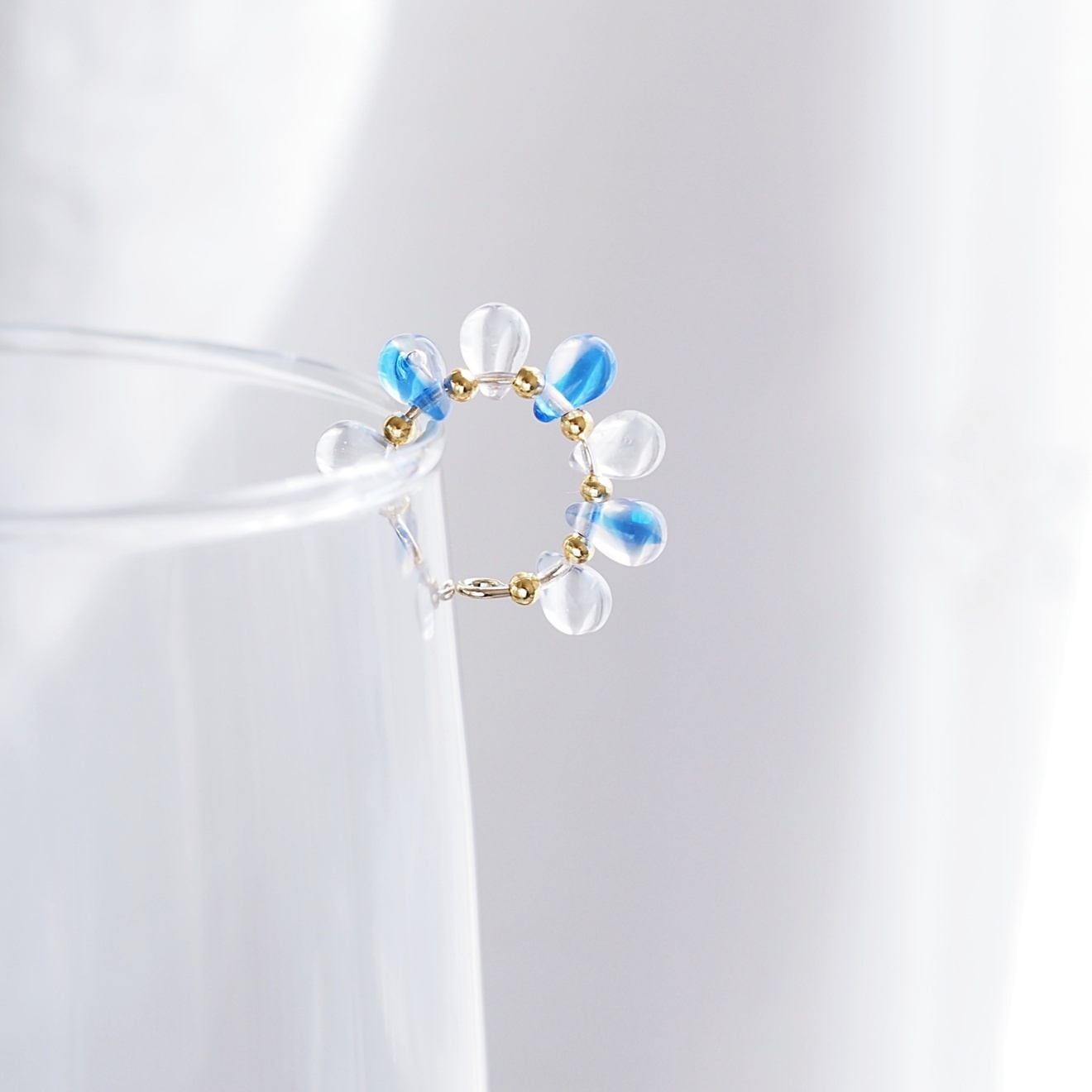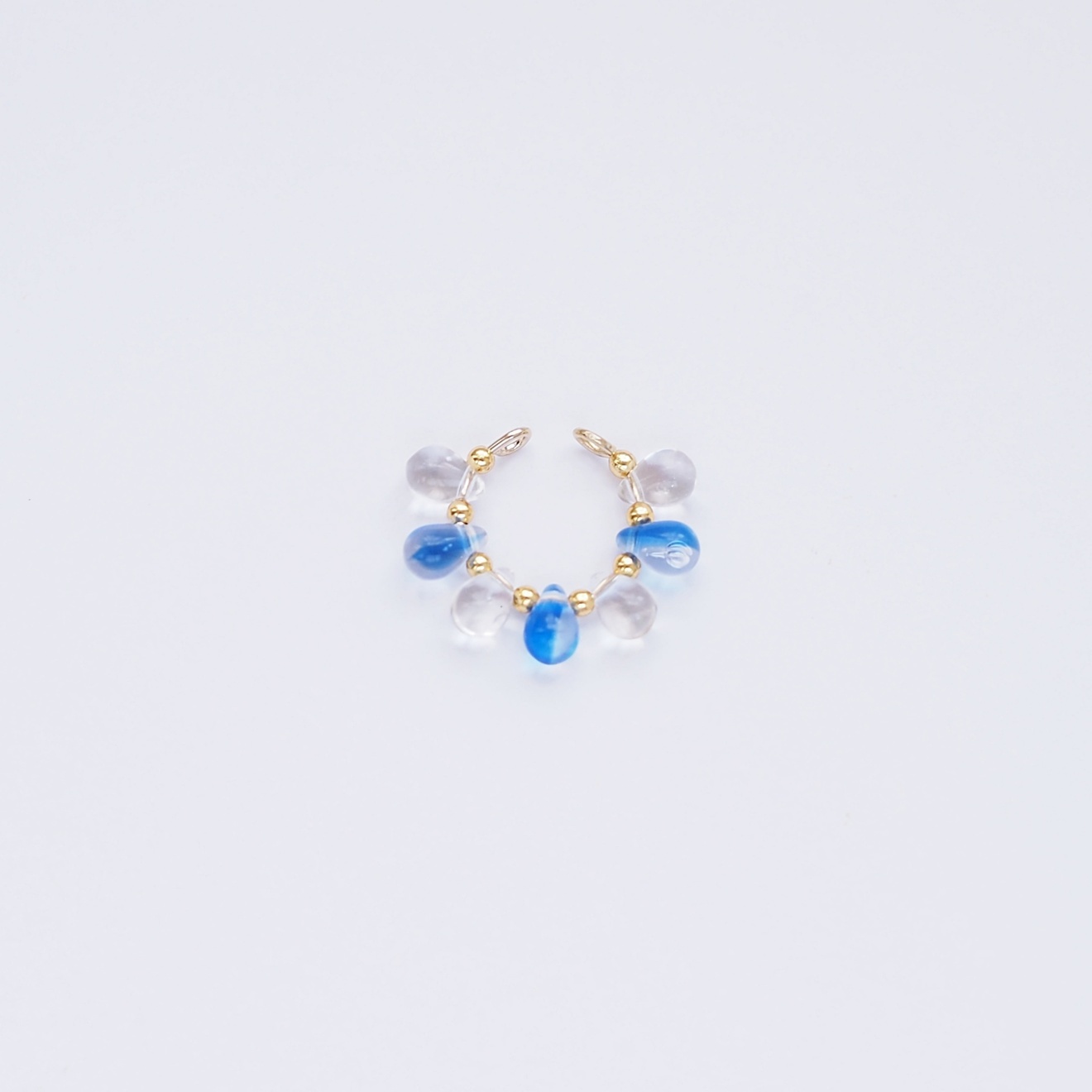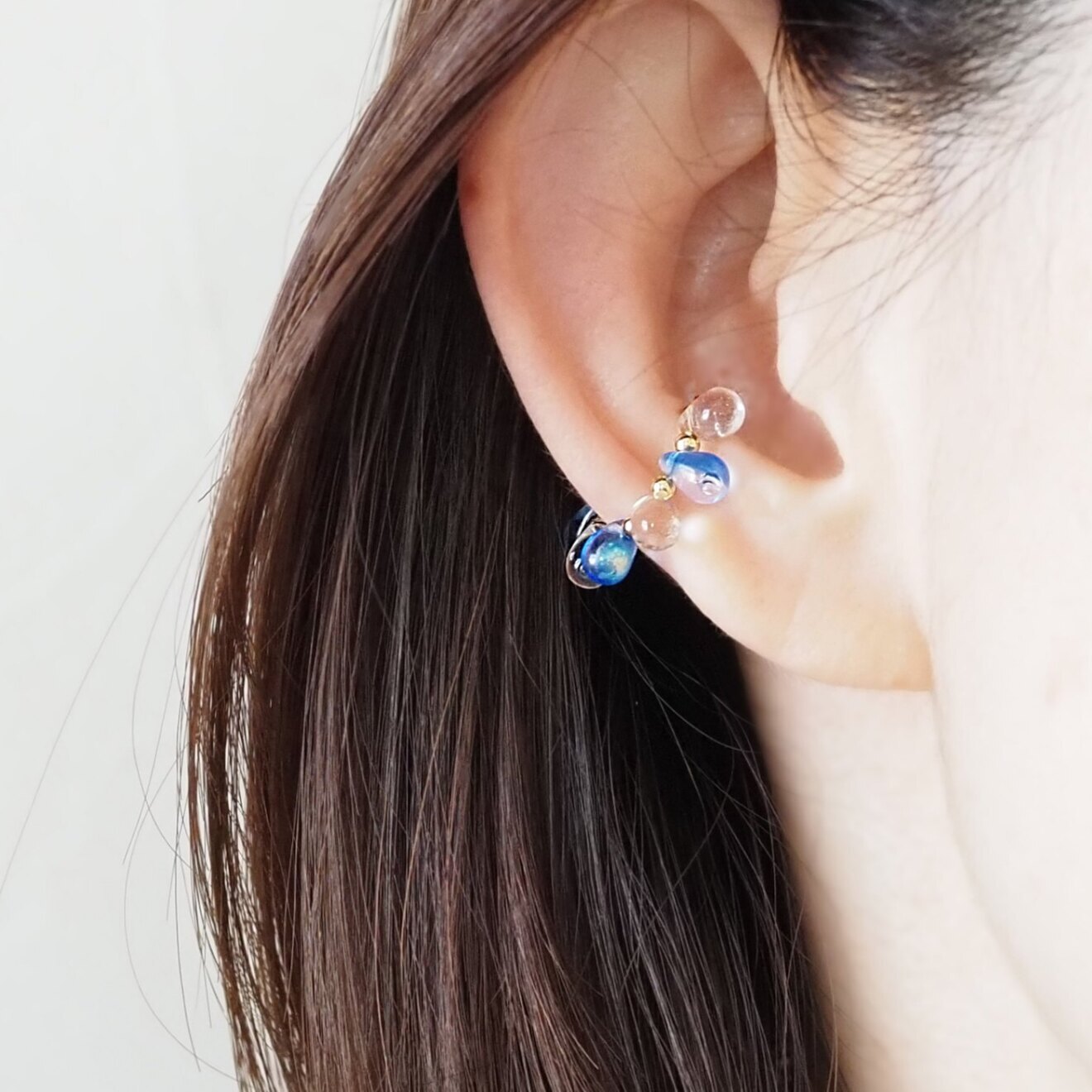 つるんとした氷のように透き通る青と、水のきらめきを閉じ込めたドロップガラスのワイヤーイヤーカフです。