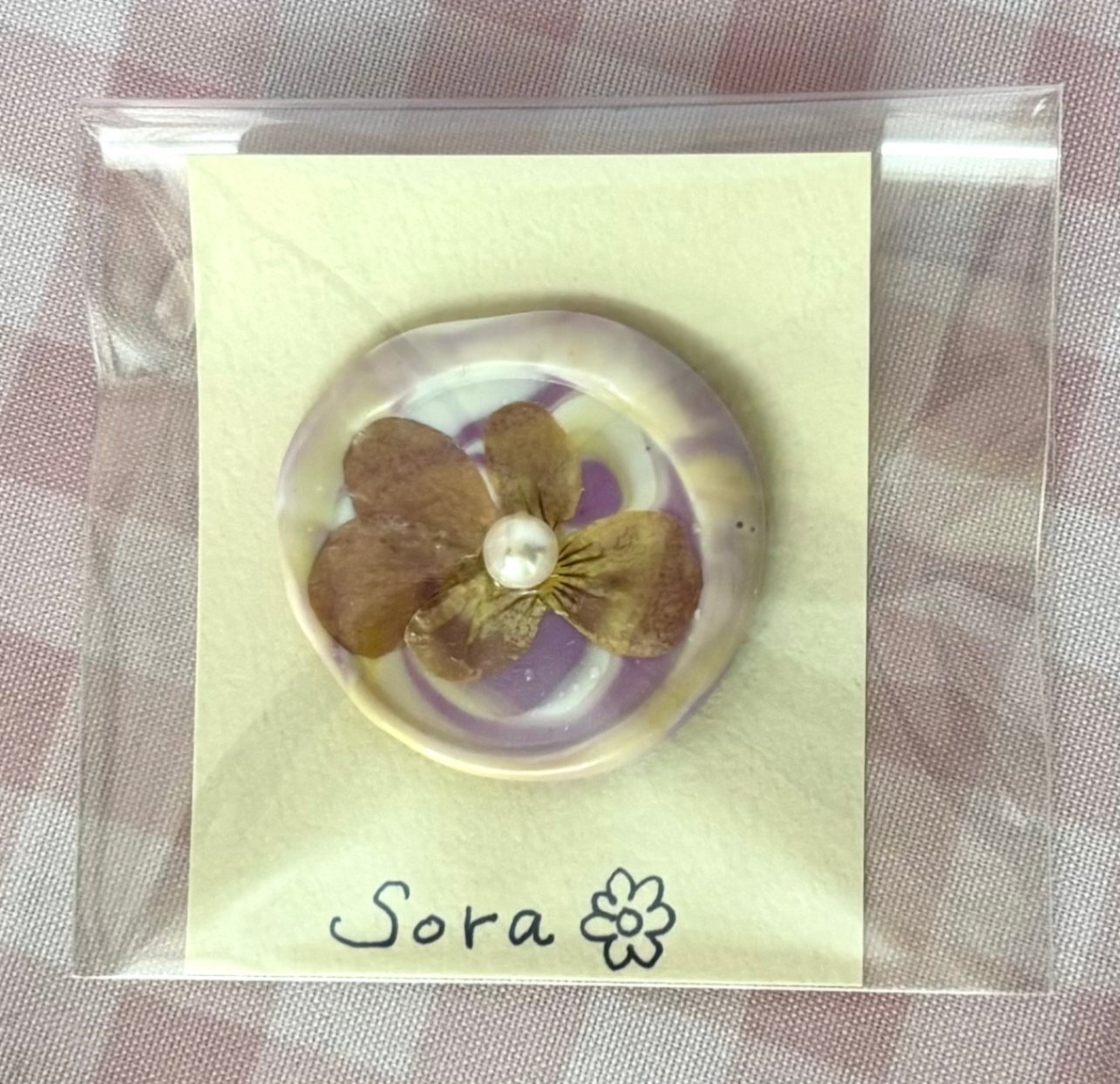 溶かしたワックスを垂らし、上にドライフラワーを置いて無地のヘッドでスタンプしました。真ん中のパールビーズがワンポイントになっていて可愛いです🌼