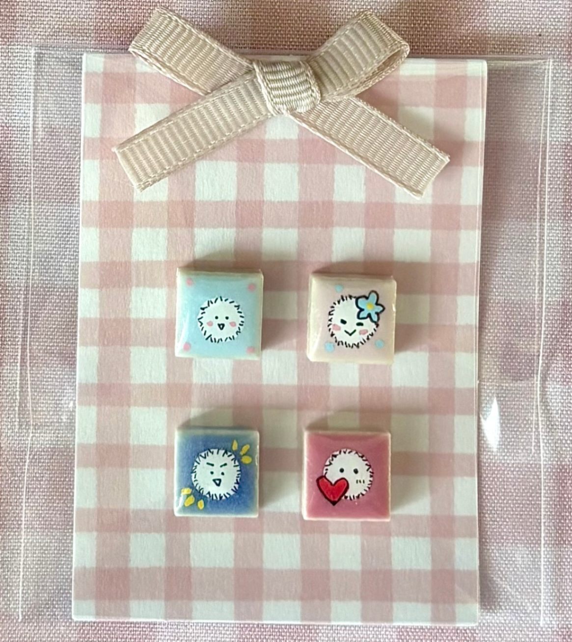 1cm×1cmのミニタイルにアクリマーカーで、イラストを描いたものをシールにしました。
