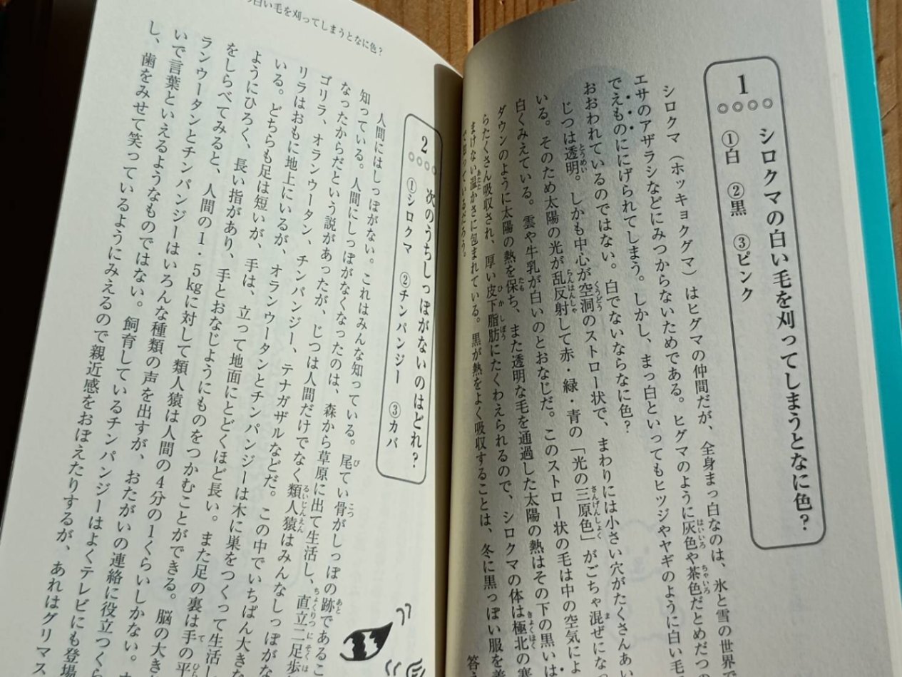 動物に関する面白い雑学や日常の疑問を三択クイズ形式で楽しめる本です。