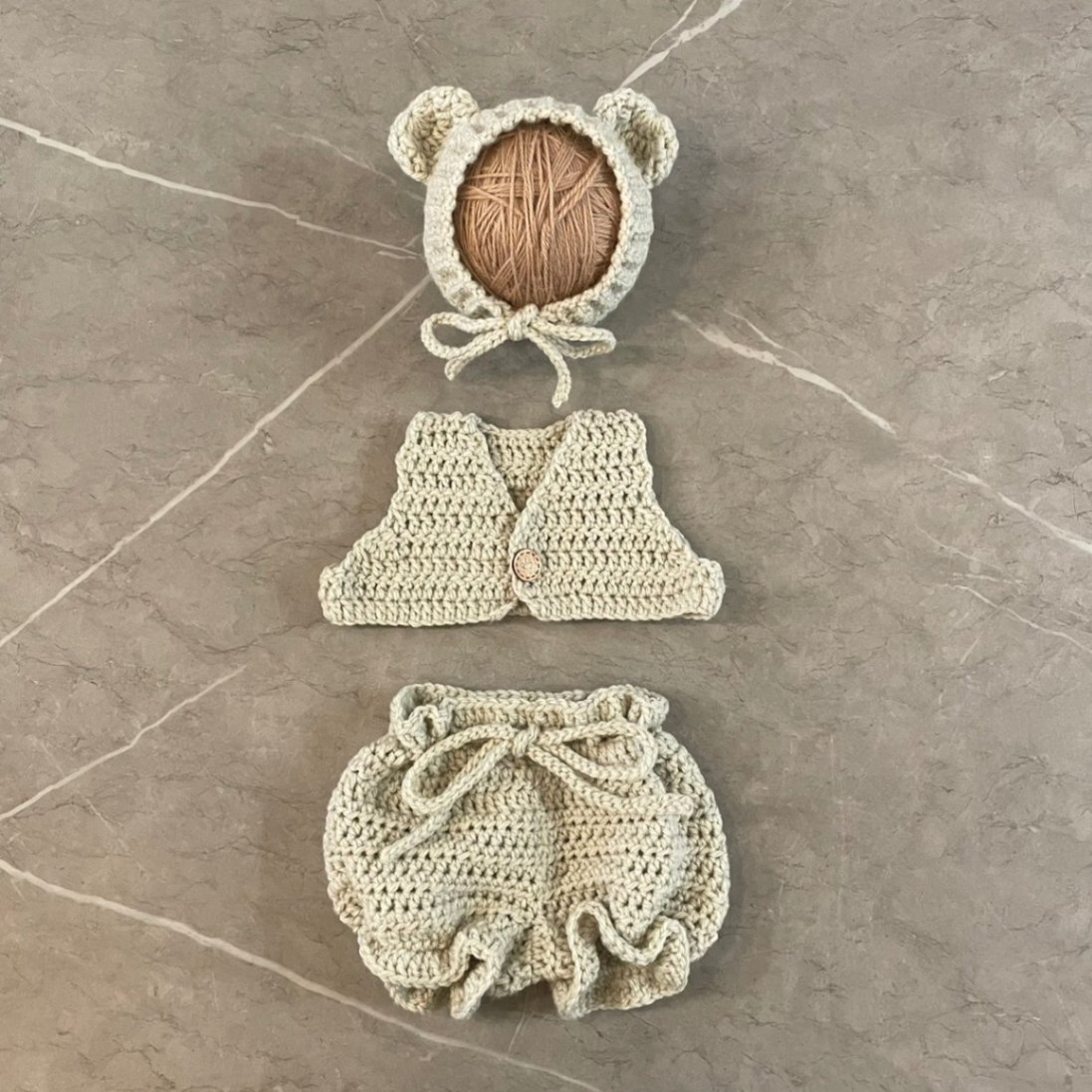 【ニューボーンフォト】手編み くまコスチューム3点セット(グレー)/ ベビー衣装 出産祝い