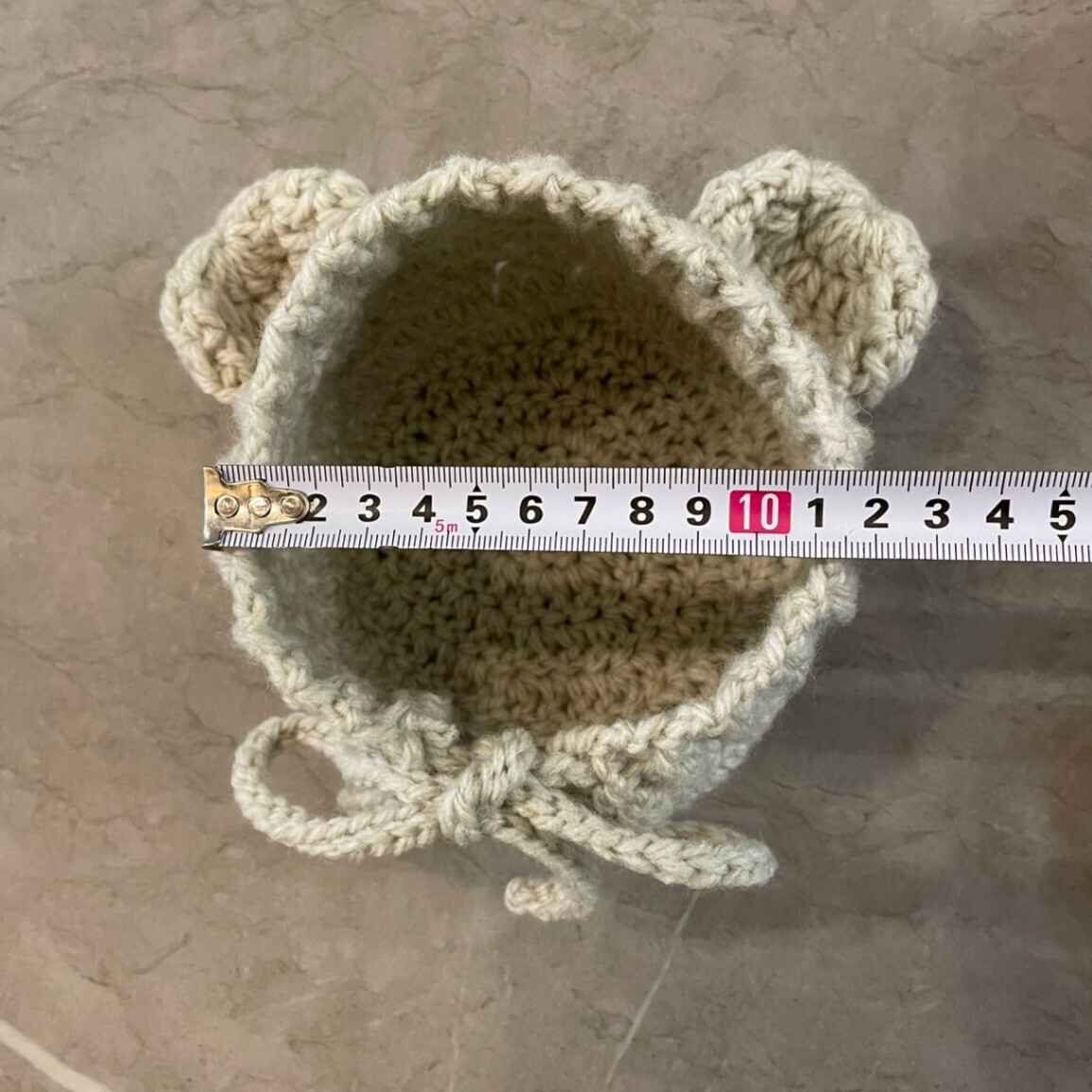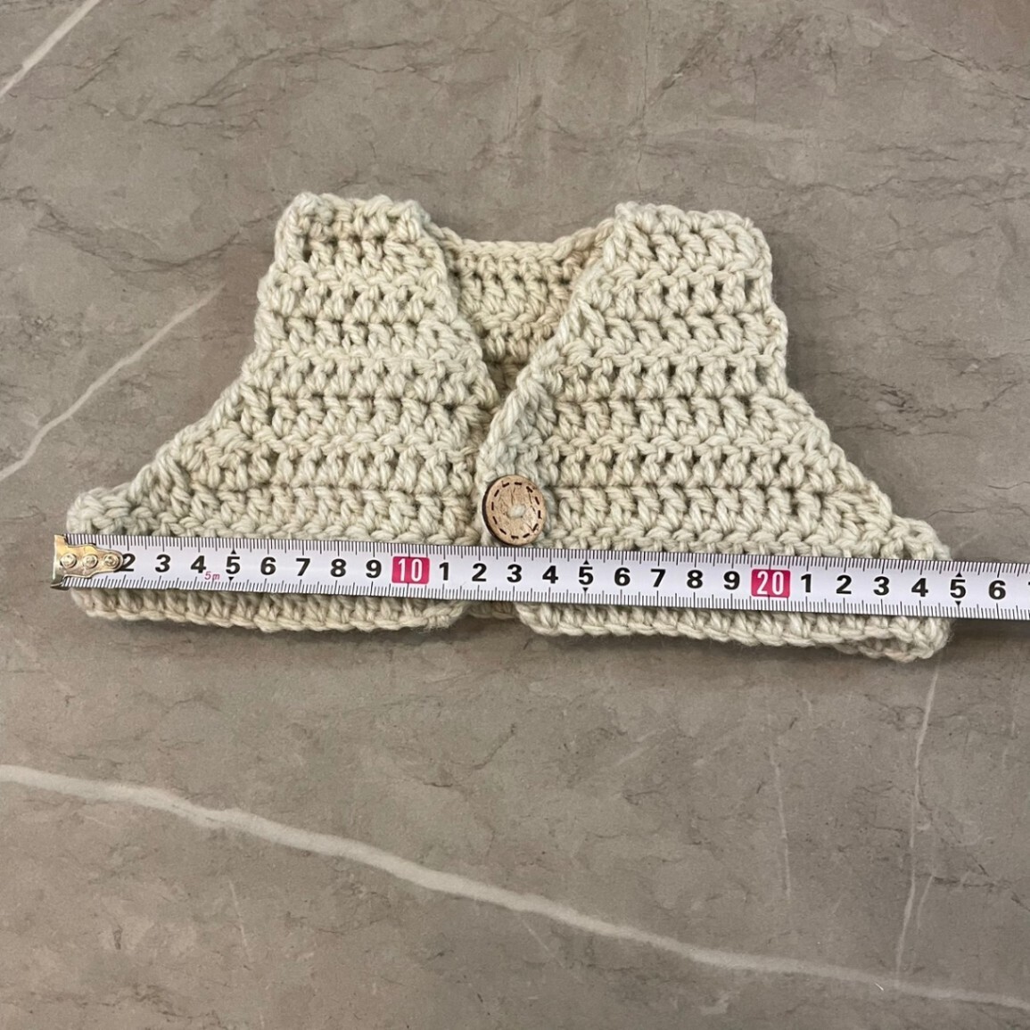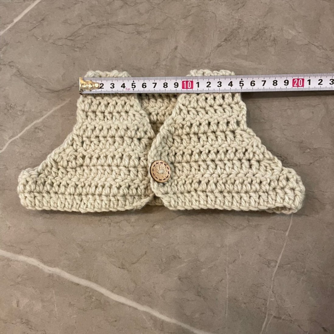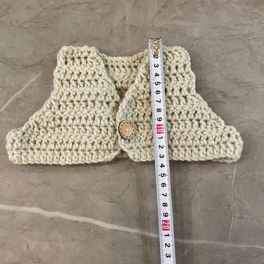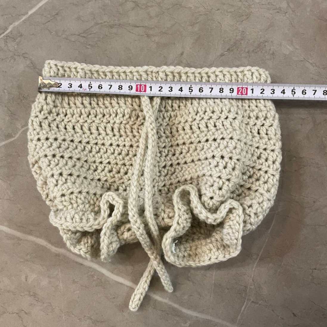 ボンネットとパンツはリボンで結ぶタイプで、長さ調節もしやすいかと思います。伸縮性のある編み方をしています。ベストは伸縮性は弱いですが、少し大きめに作っています!