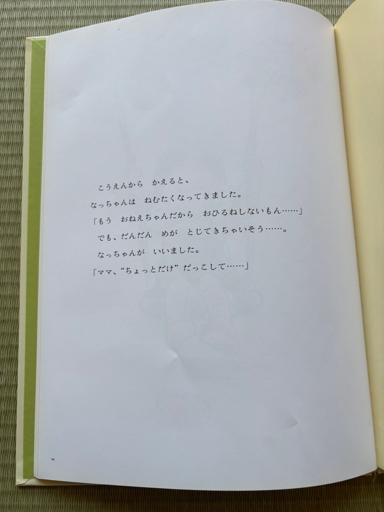 赤ちゃんが生まれて忙しくなったお母さん。主人公の女の子なっちゃんは、これまでお母さんにしてもらっていたことを「ちょっとだけ」自分で頑張ろうとします。そんな姿がとてもいじらしく、読んでいる大人の心にも深く響く作品です。