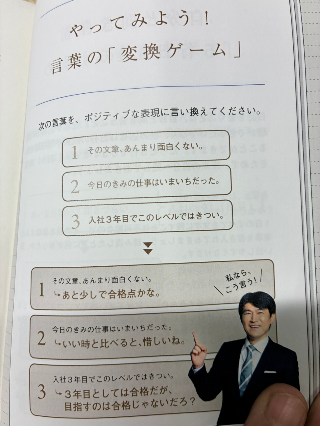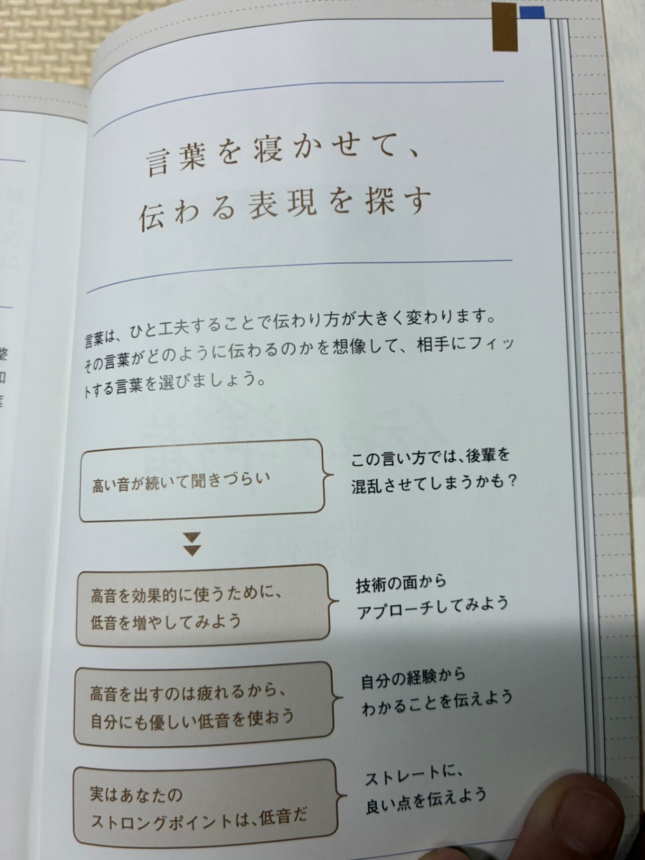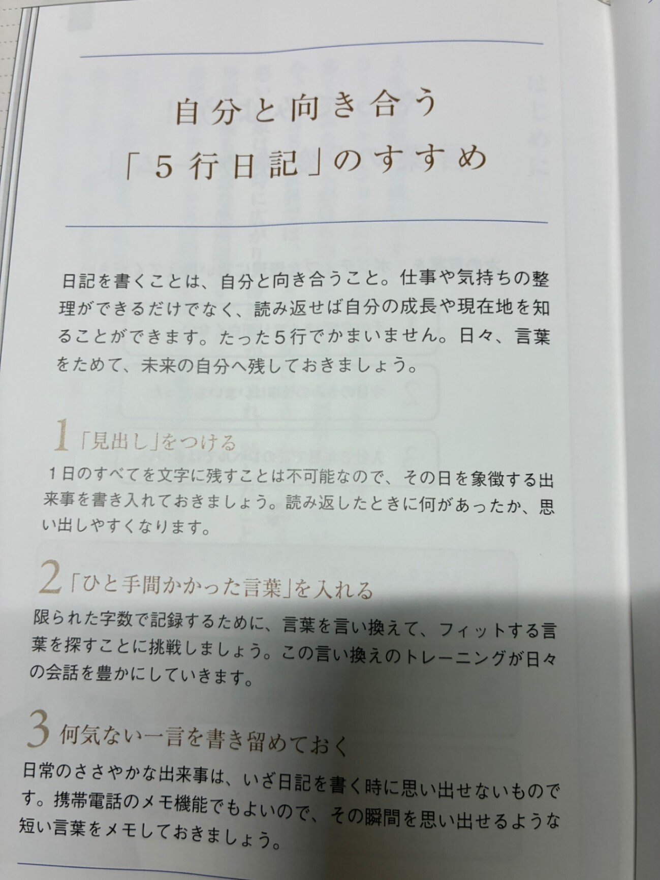・日々の経験や気づきを「5行日記」に絞って言葉を続けることで、自分の土台を作り、いざ場面で使える表現の引き出しを増やす「言葉のストック法」を紹介している。