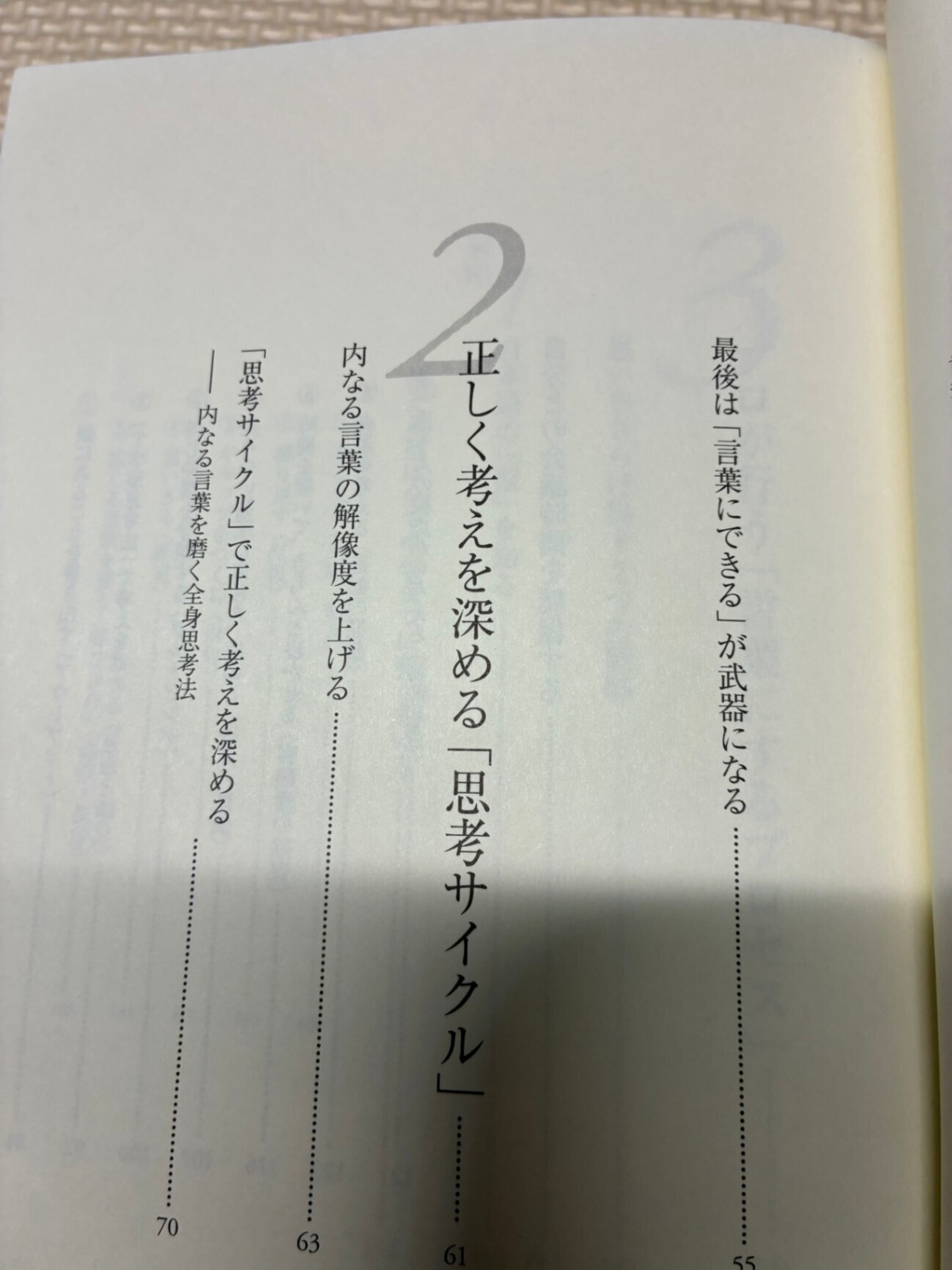 ・内なる言葉を磨くための「思考サイクル」(内なる言葉として考える→俯瞰して観察する→解像度を上げる)や、A4用紙に書き出す・分類する・視点をずらす(T字型思考)など、具体的な思考・言語化トレーニング法が提案されている。