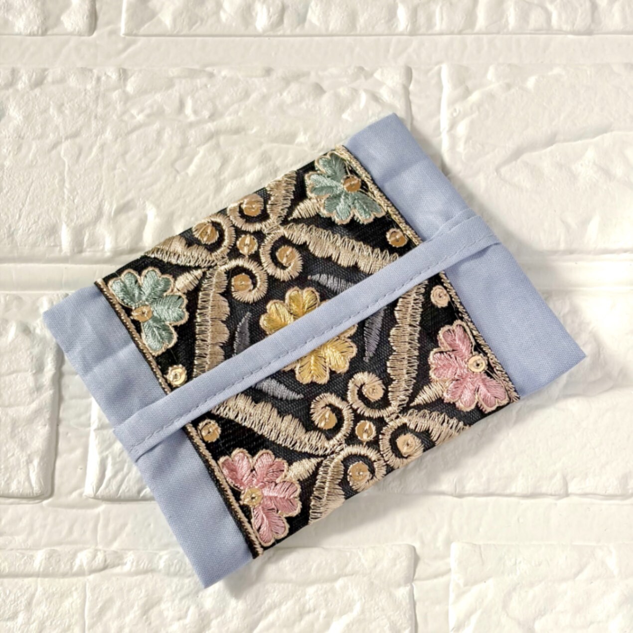 爽やかなブルーの布地にブラック×カラフルなインド刺繍リボンを組み合わせた、大人な色合いです🫐🩵