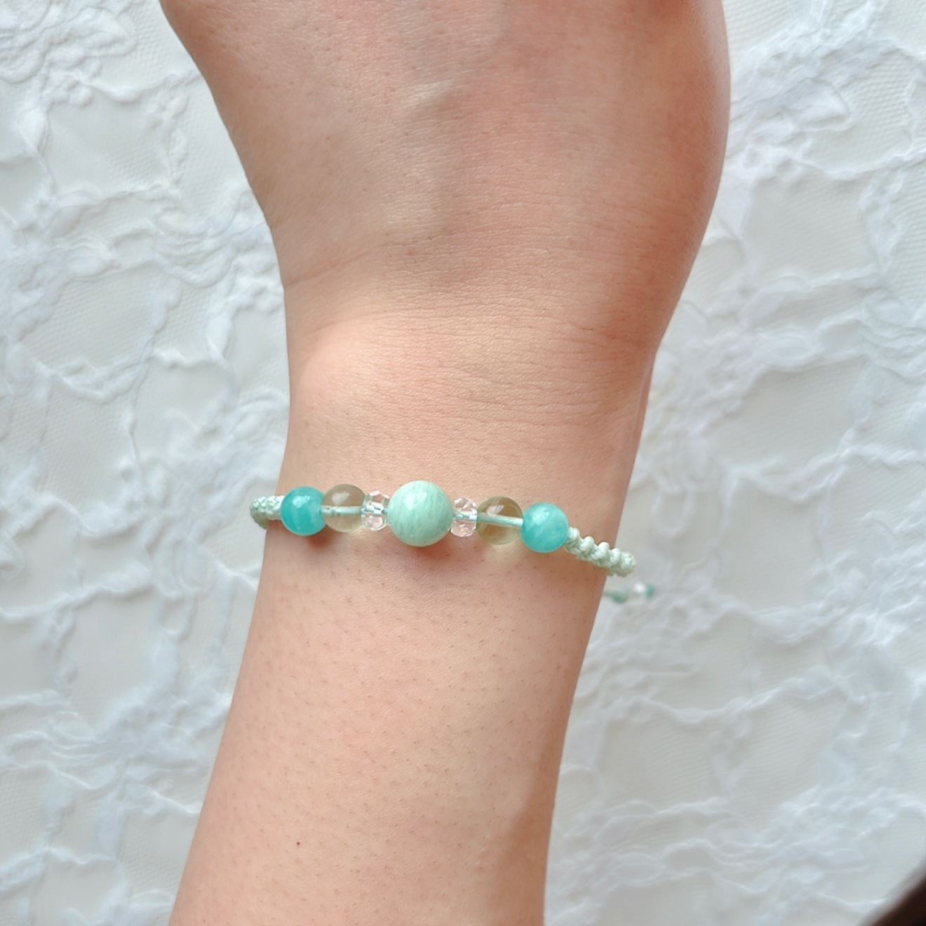 そのまわりには思考をすっきり整えてくれるグリーンフローライトと希望や前向きな気持ちを引き出してくれるアマゾナイトを組み合わせました。