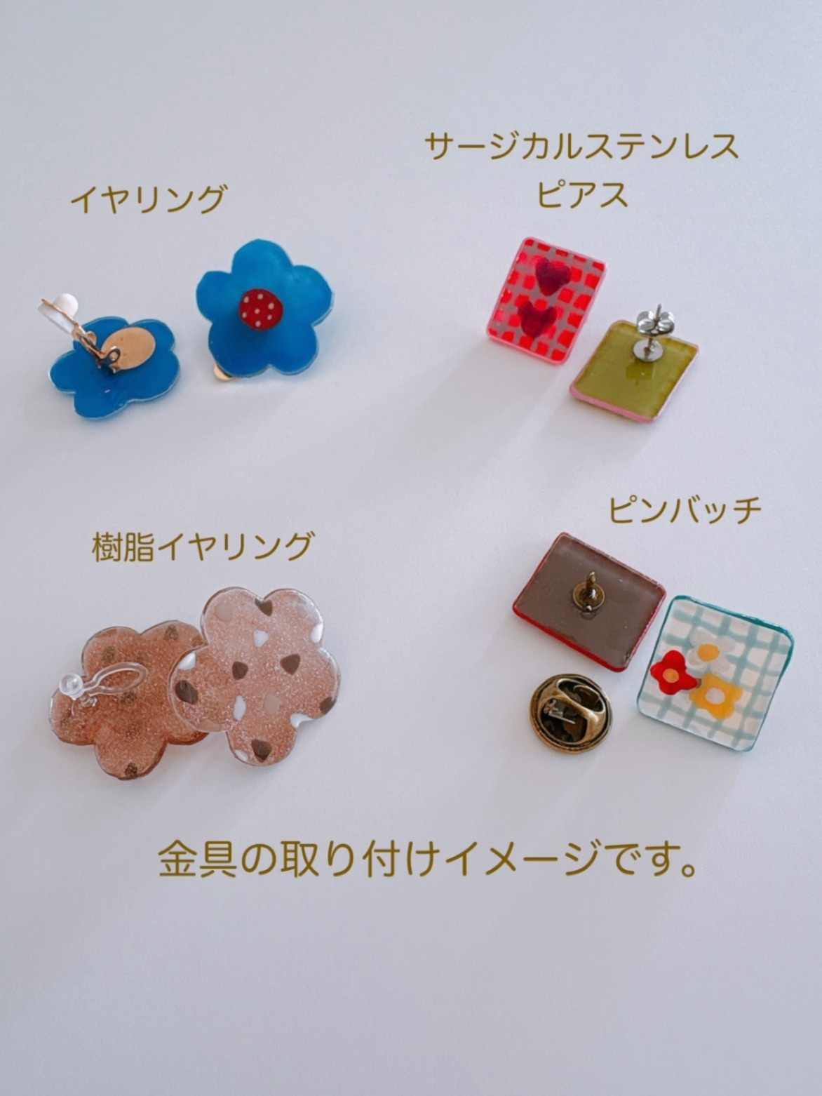 ピアス、イヤリング、ピンバッチから金具選択できます。