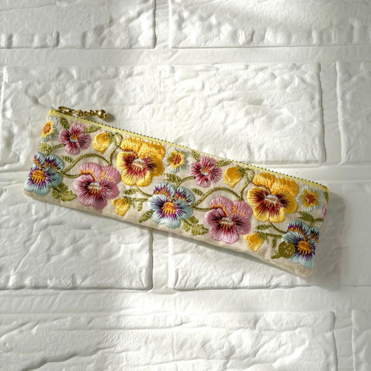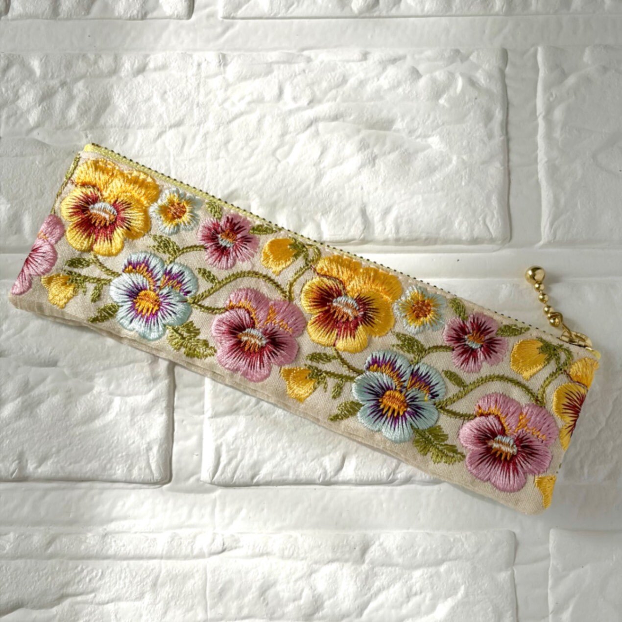しっかりとした布地に、美しい刺繍が施されたインド刺繍リボンを使用したポーチです。
